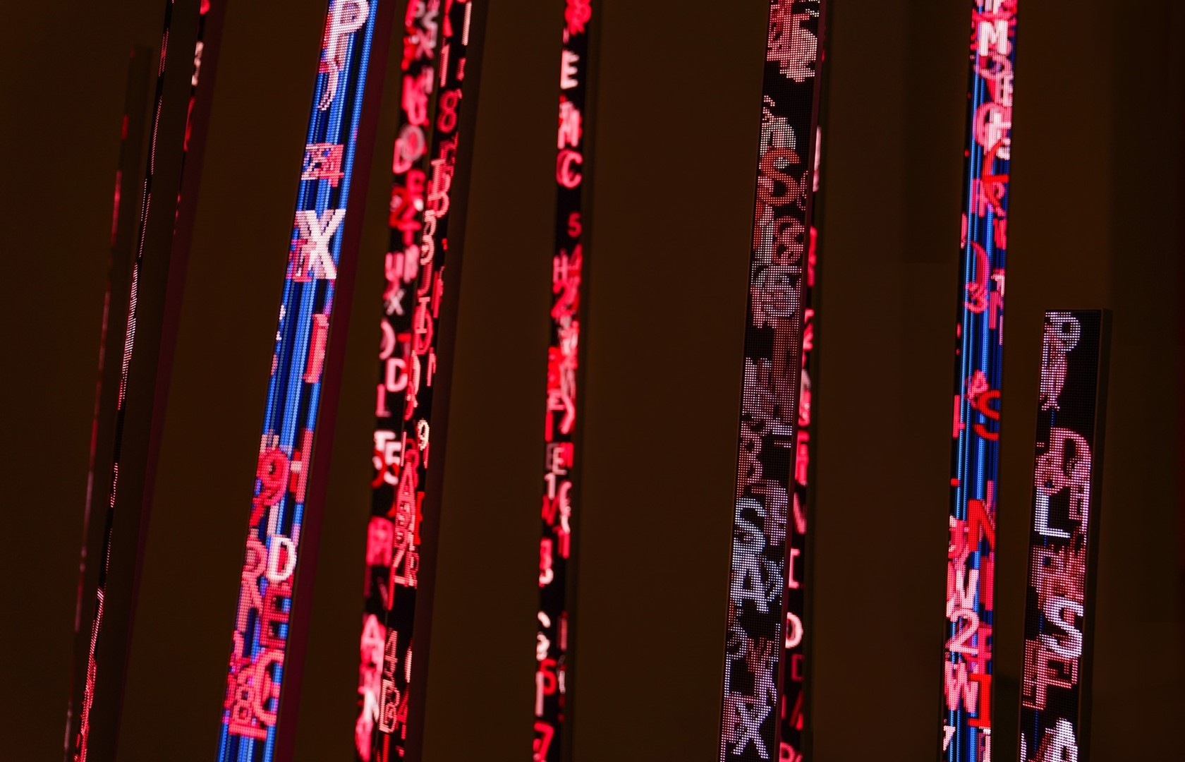 Medio: Pantallas LED escultóricas, estructura de aluminio, ordenador, software generativo personalizado, conexión a internet.