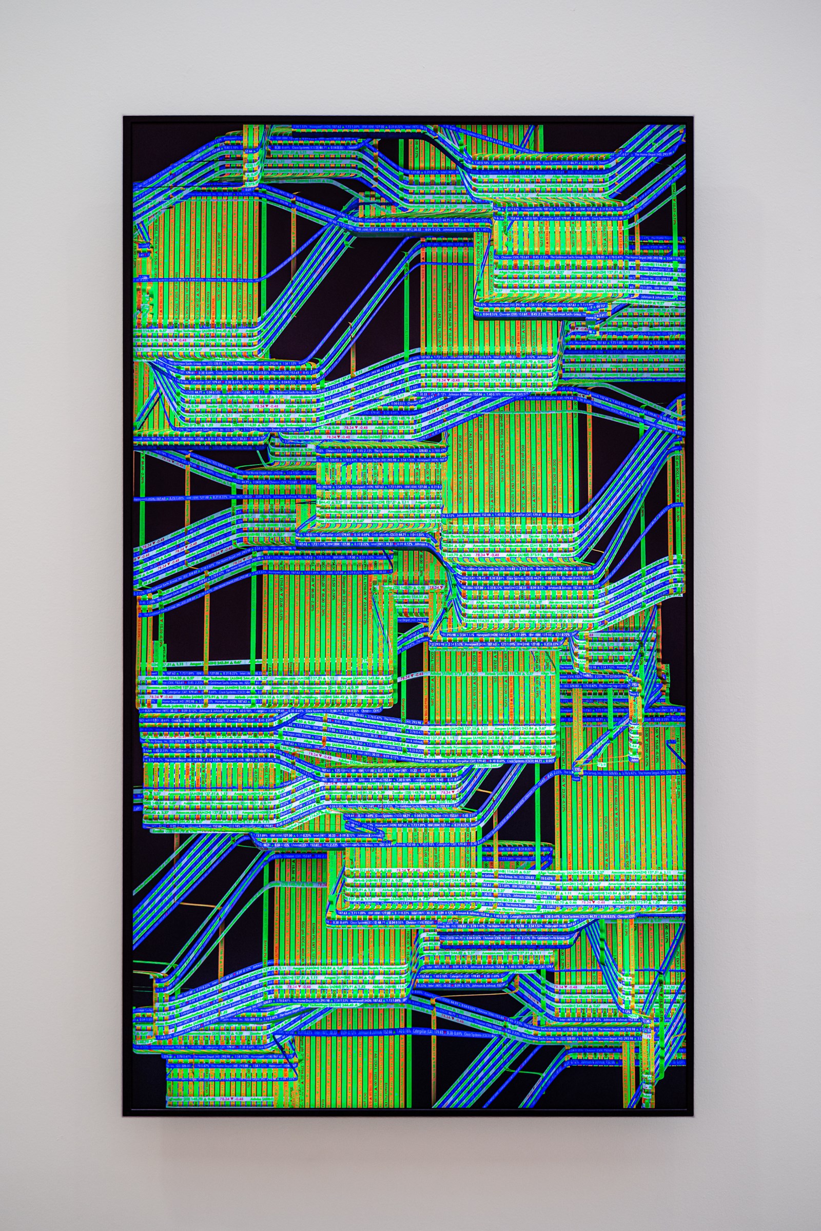 Abacus muestra y reinterpreta información financiera en tiempo real de los principales fondos índice, entre ellos el Dow Jones, el Nasdaq, el FTSE, el DAX, así como data sobre el mercado de criptomonedas y el mercado de divisas. La obra reinterpreta la cinta de teletipo perforada que fue el primer medio de comunicación financiero desde finales del siglo XIX. Las cotizaciones de cada fondo índice aparecen como bandas entrecruzadas, convirtiéndose en trama y urdimbre de un textil en constante transformación.