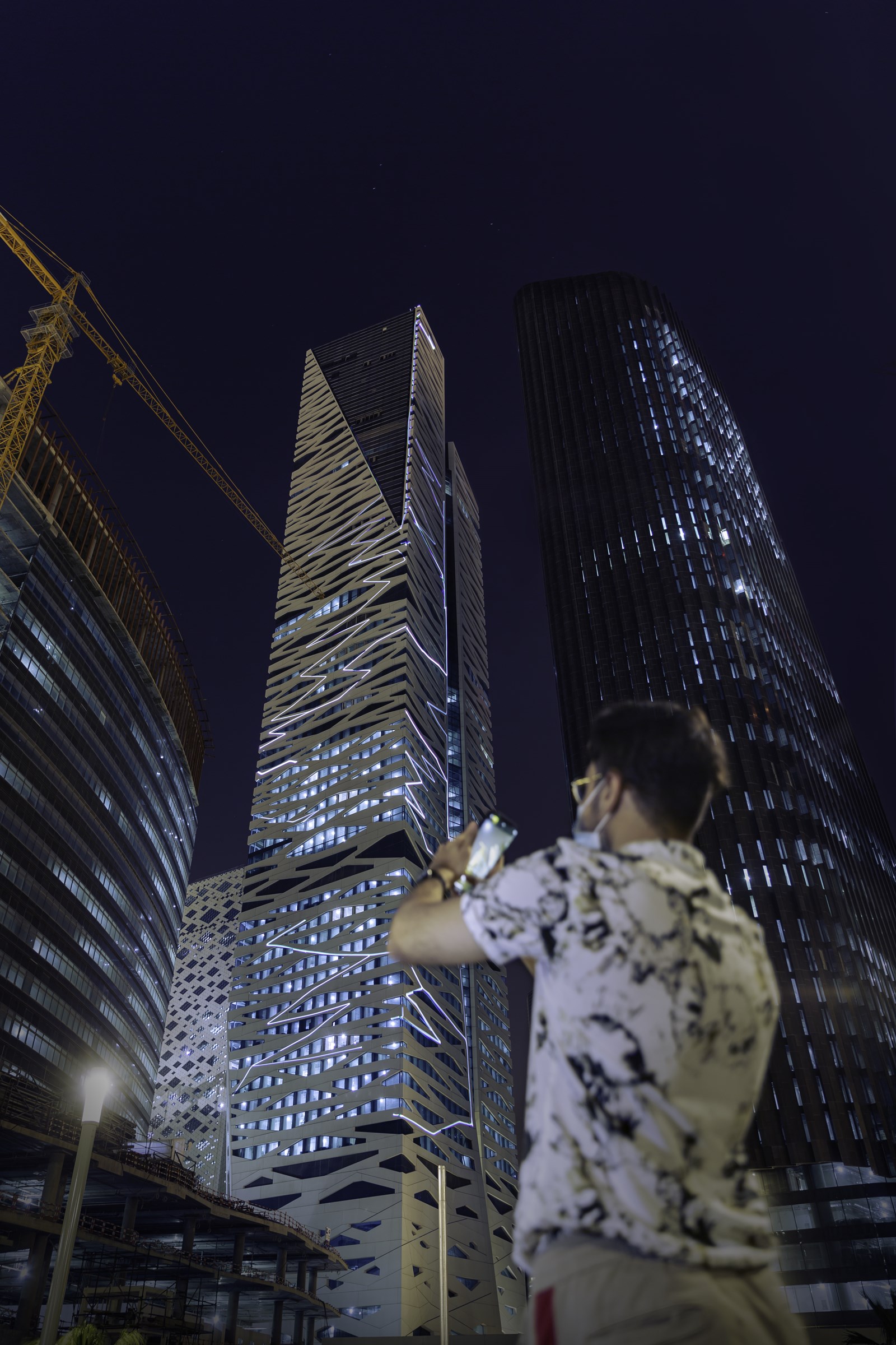 Bifurcation consists in electric-like bolts of light that zigzag up and down the Zebra Building. Connected to the internet, Bifurcation reacts in real time to thunderstorms happening around the globe. The algorithm created by the artist’s studio uses real-time data from a storm- tracking webpage. Some of the data that is interpreted includes the location of the storm, if the lightning bolts are vertical or horizontal, positive or negative, and the amperes of the lightning strike. All this information is processed to create a generative animation that constantly changes and never repeats itself.