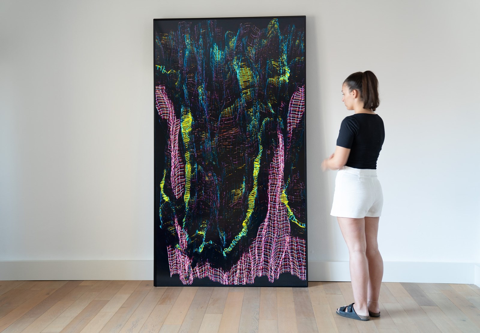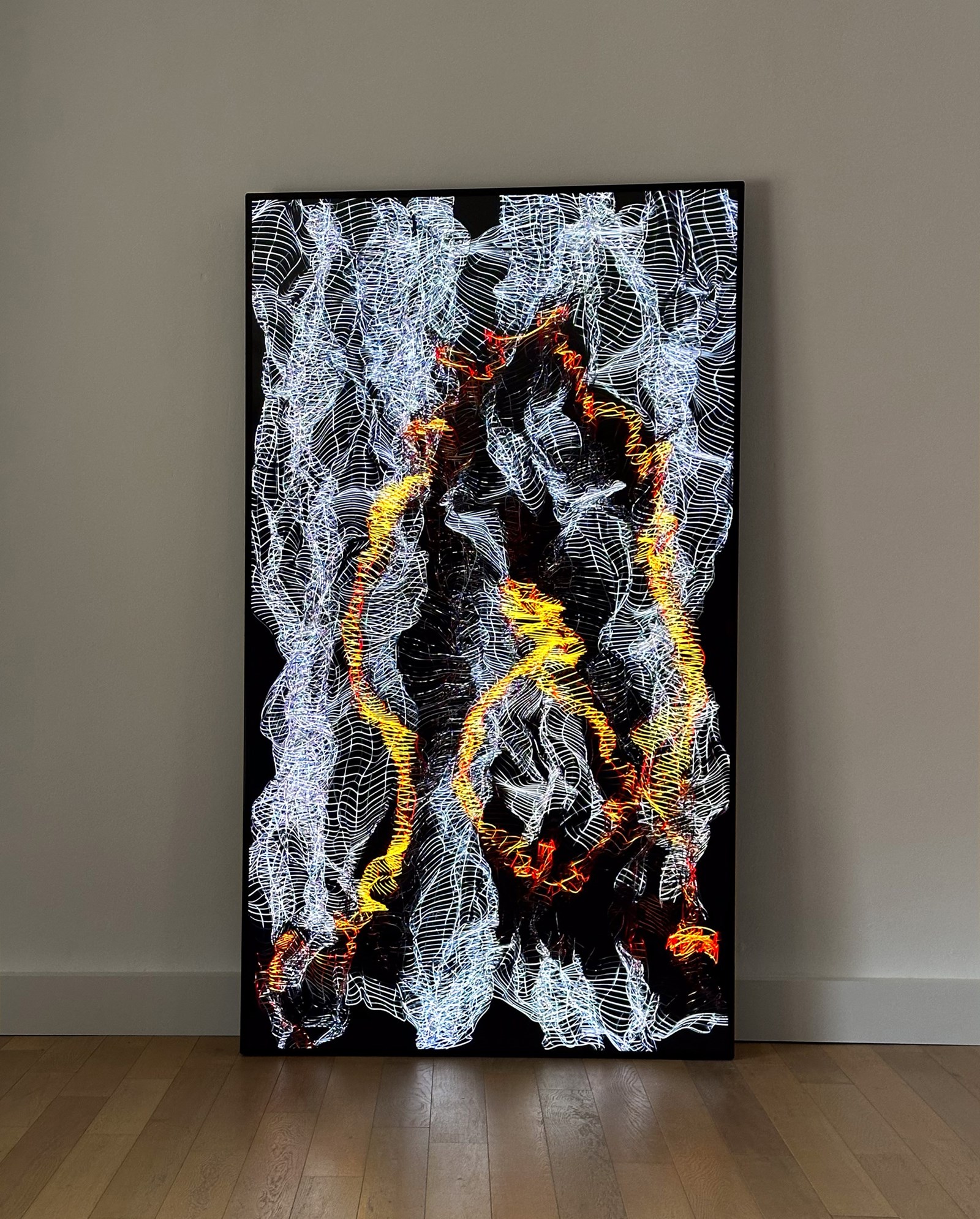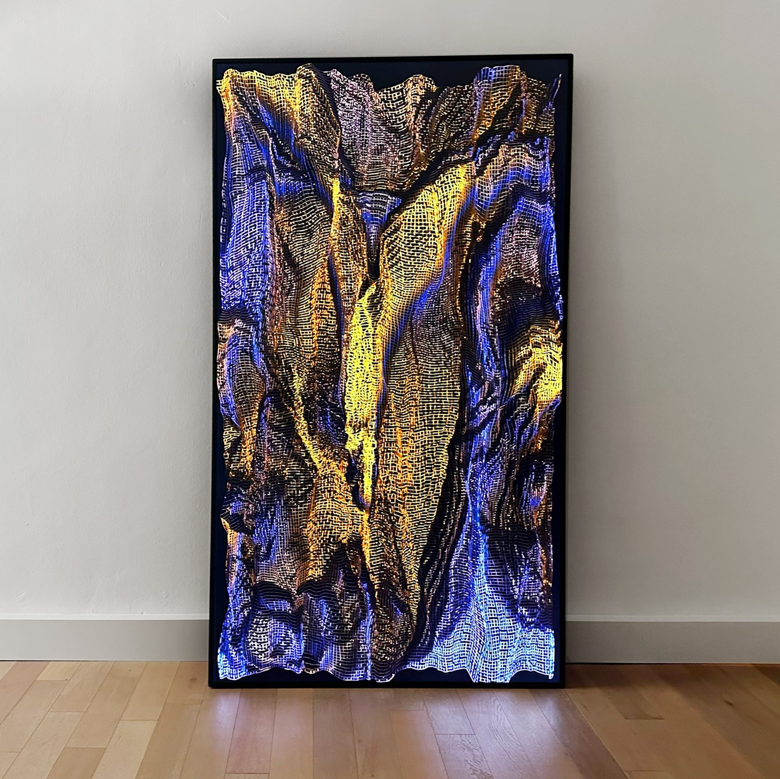 Kairos is a generative artwork that responds in near real-time to mergers of massive stellar objects, which generate distortions in spacetime called gravitational waves. The piece is connected to NASA’s General Coordinates Network and listens for gravitational wave events detected by the LIGO, the world's largest gravitational wave observatory. The artwork cycles through four distinct events: mergers between black holes, mergers between neutron stars and black holes, mergers between neutron stars and unknown phenomenon yet to be identified.