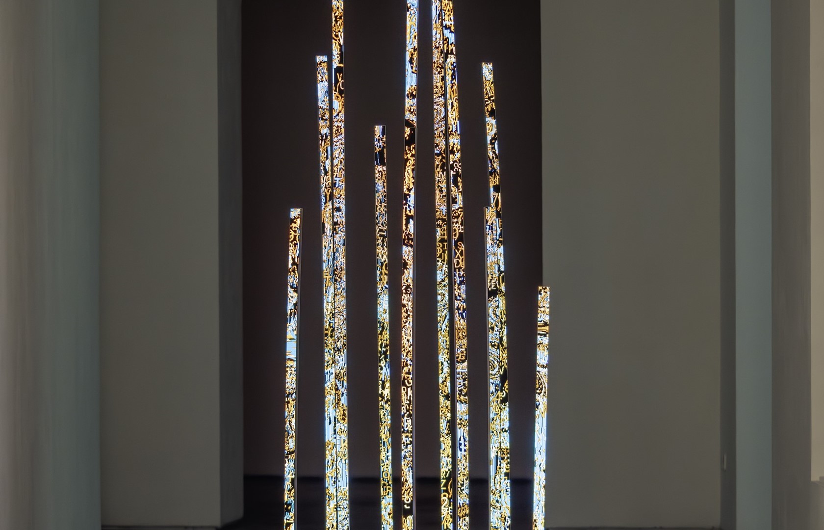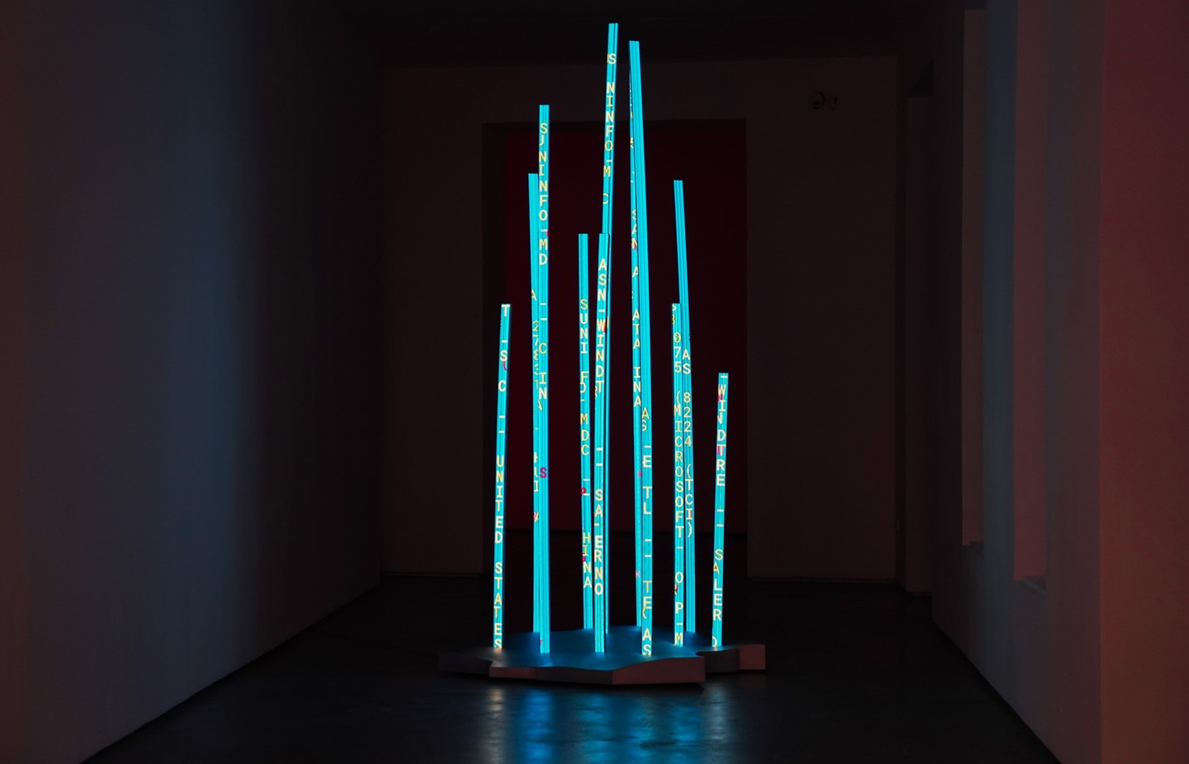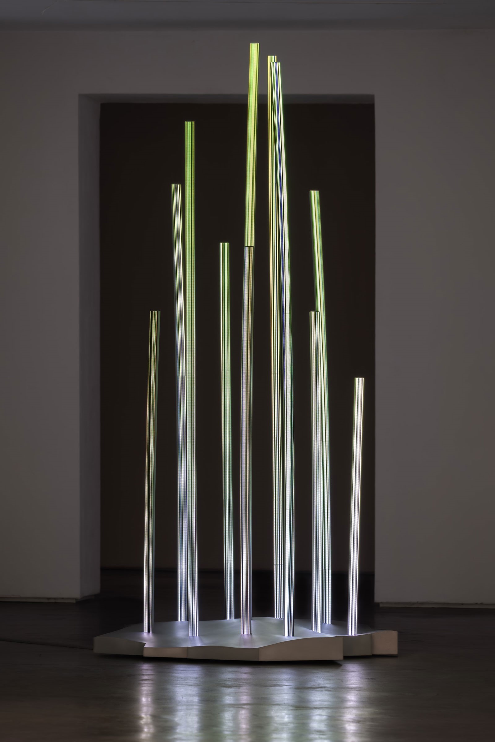 Medio: Pantallas LED escultóricas, estructura de aluminio, ordenador, software generativo personalizado, conexión a internet.