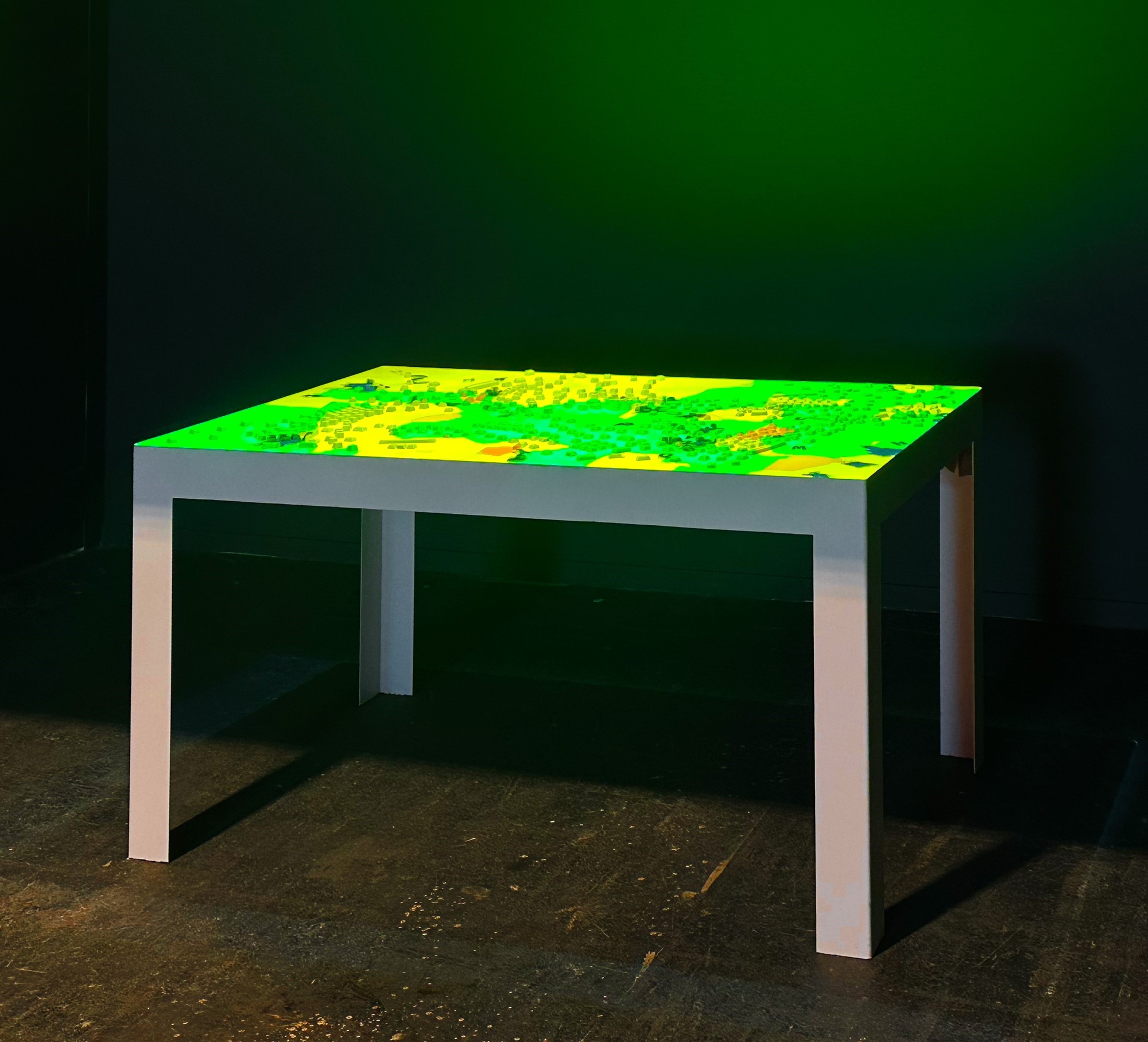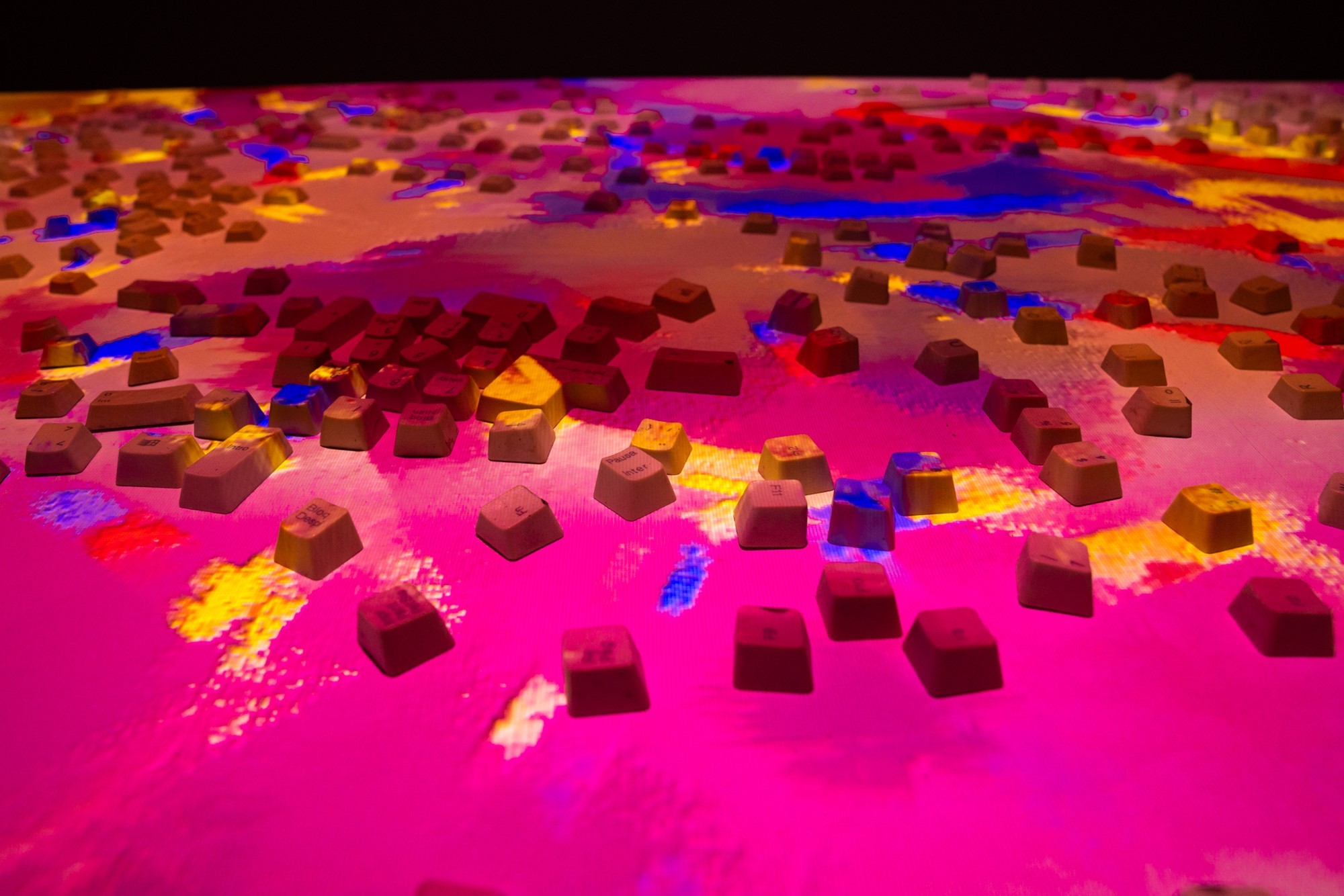 Medio: Teclados desechados, proyector, reproductor de vídeo, mesa metálica.