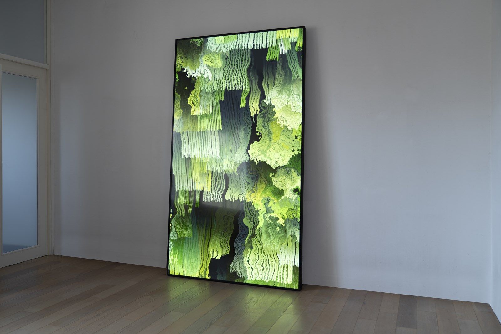 Pantalla Full HD, programación generativa, estructura metálica, ordenador.