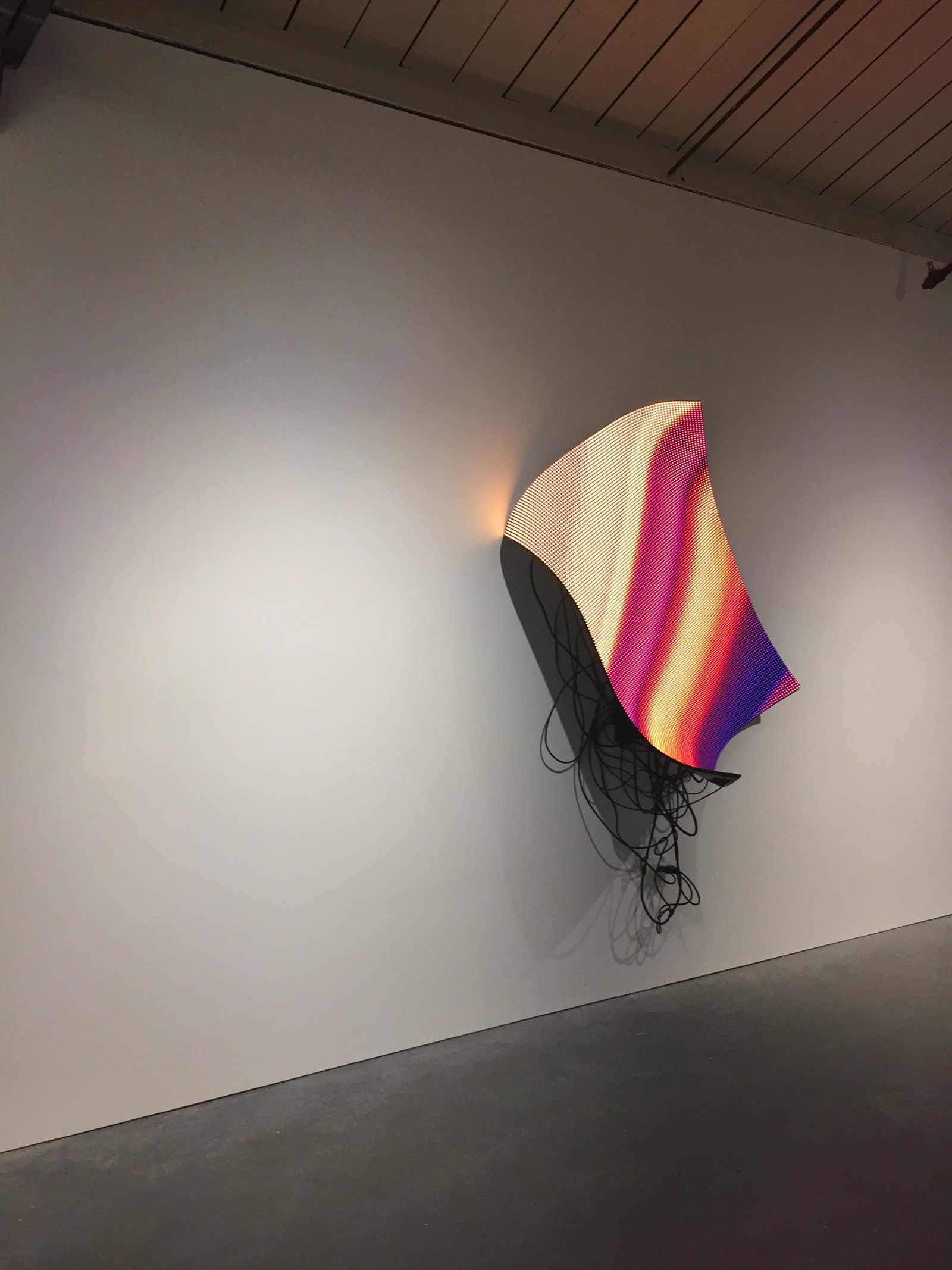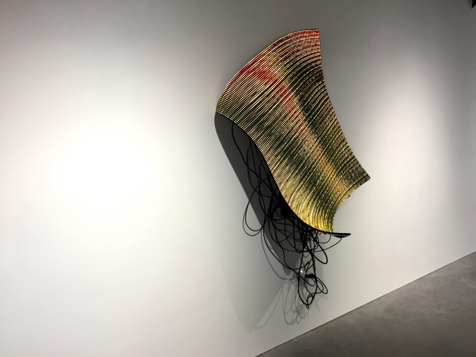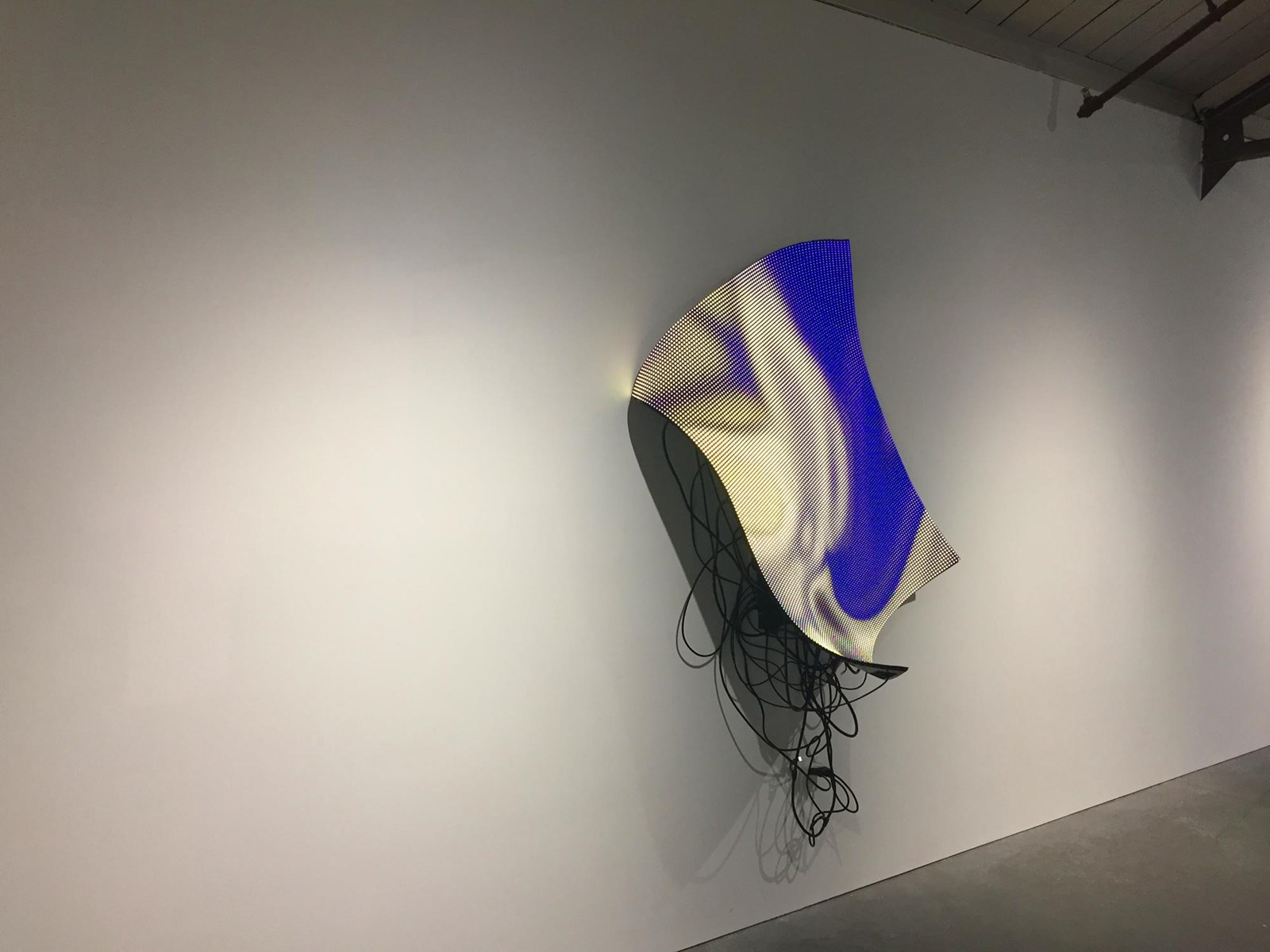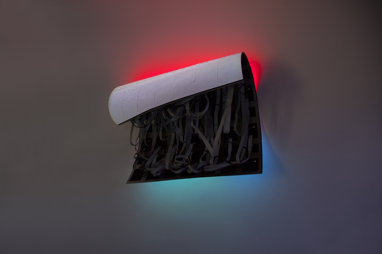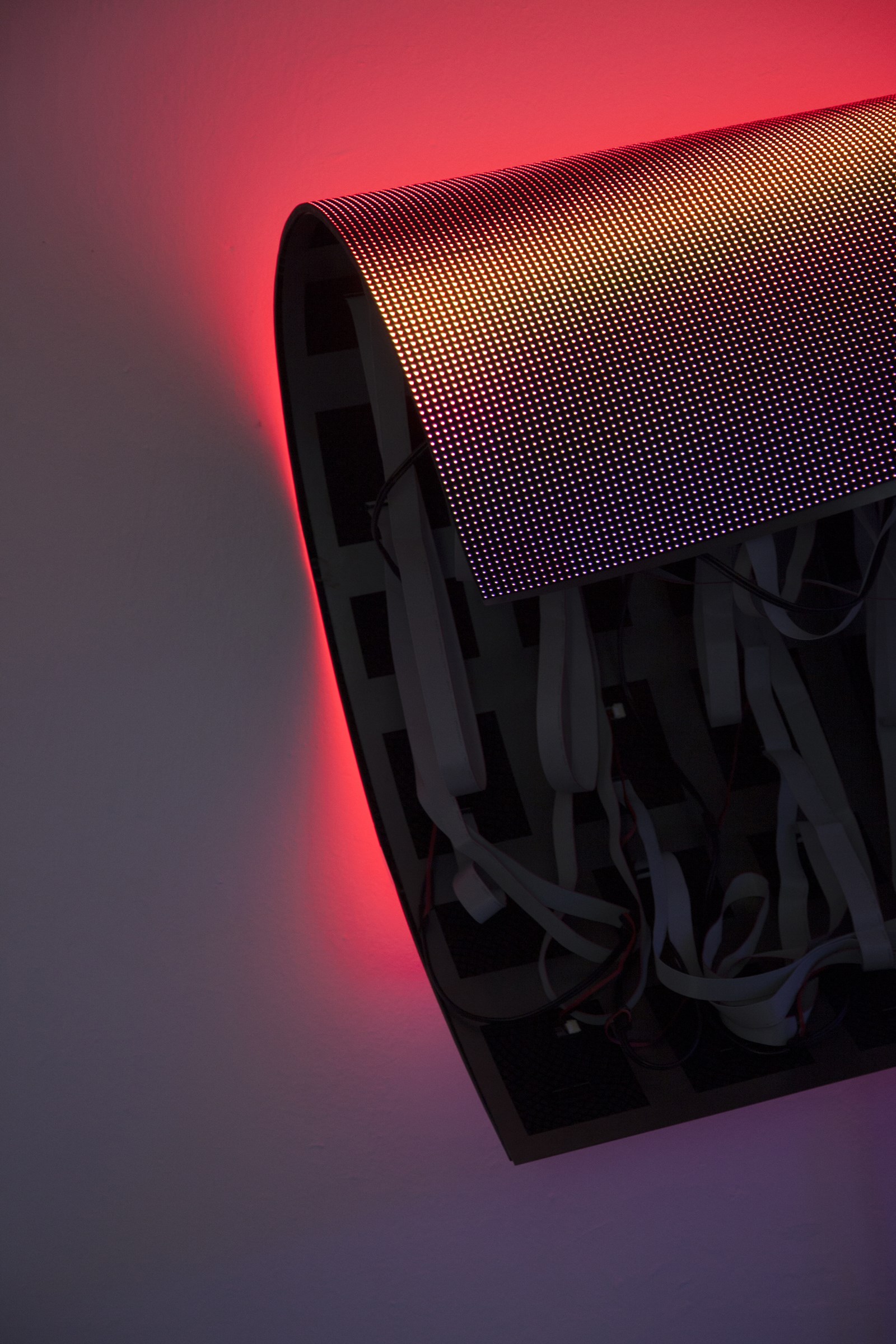 Pantalla flexible de LED, ordenador, programación generativa, datos obtenidos en tiempo real, estructura metálica.