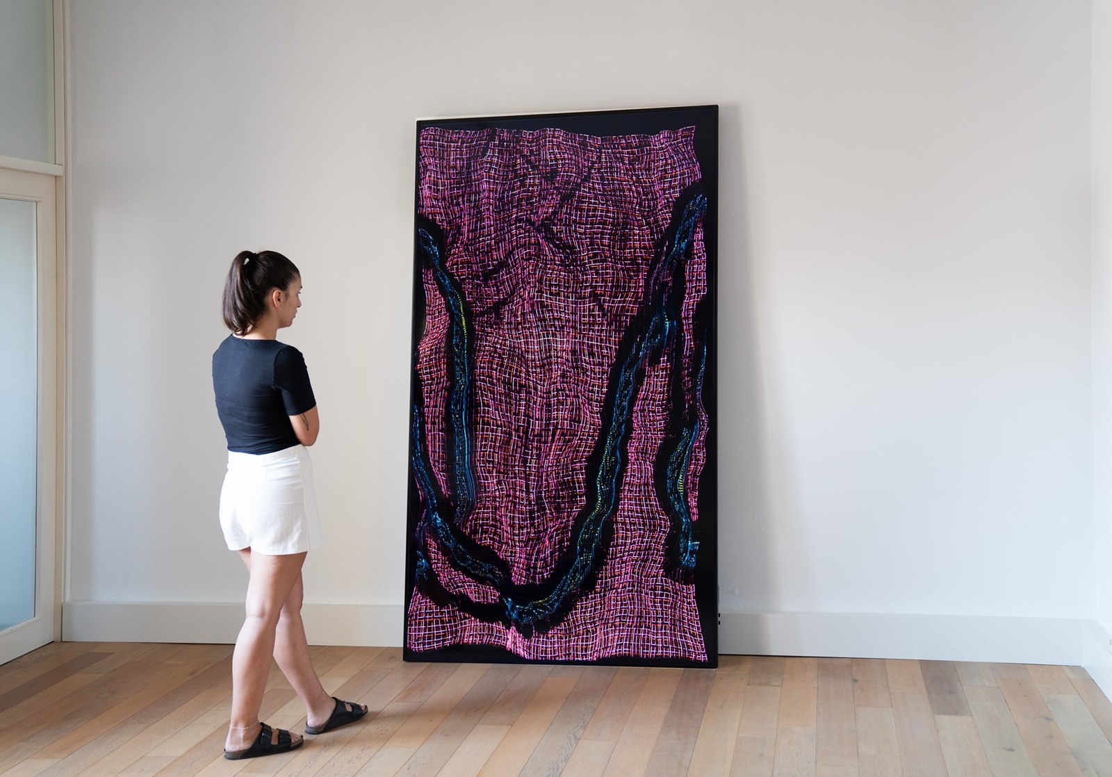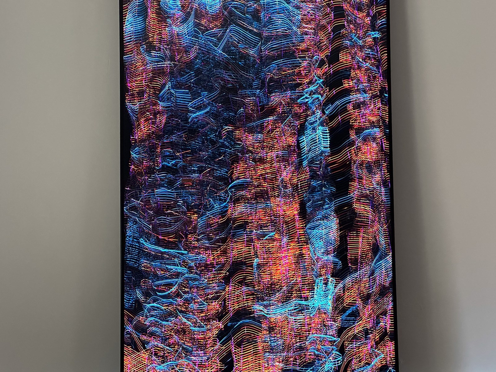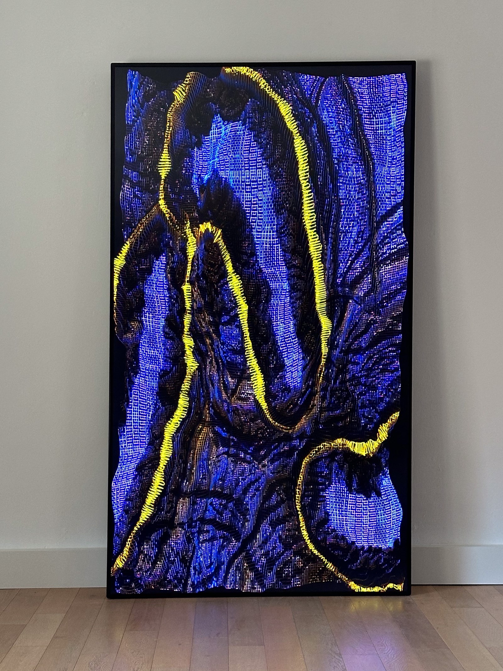 Kairos es una interpretación artística de cómo los objetos masivos crean ondulaciones en el espacio-tiempo, un concepto de la física cuántica que ilustra la intrincada interconexión del universo. Basada en la teoría de la relatividad de Einstein, representa el continuo espacio-tiempo como una especie de tejido que se ondula y se deforma bajo la influencia de fuerzas gravitacionales. En Kairos, esta metáfora cobra vida. El tejido que vemos en la pantalla es una representación bidimensional de una tela imaginaria que envuelve nuestro planeta. La pantalla superior refleja el hemisferio norte y la inferior el hemisferio sur. Los pulsos que emergen en el tejido indican la ubicación de los eventos gravitacionales detectados desde la perspectiva de la Tierra.