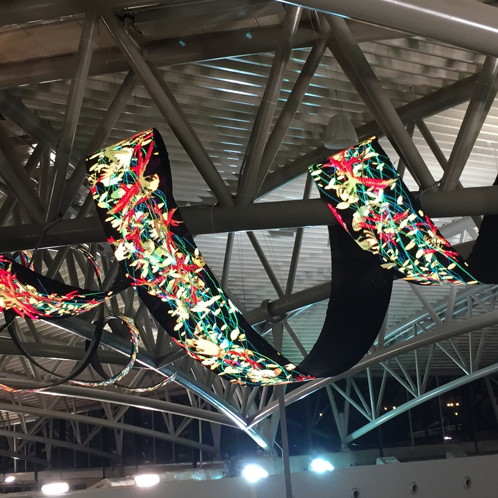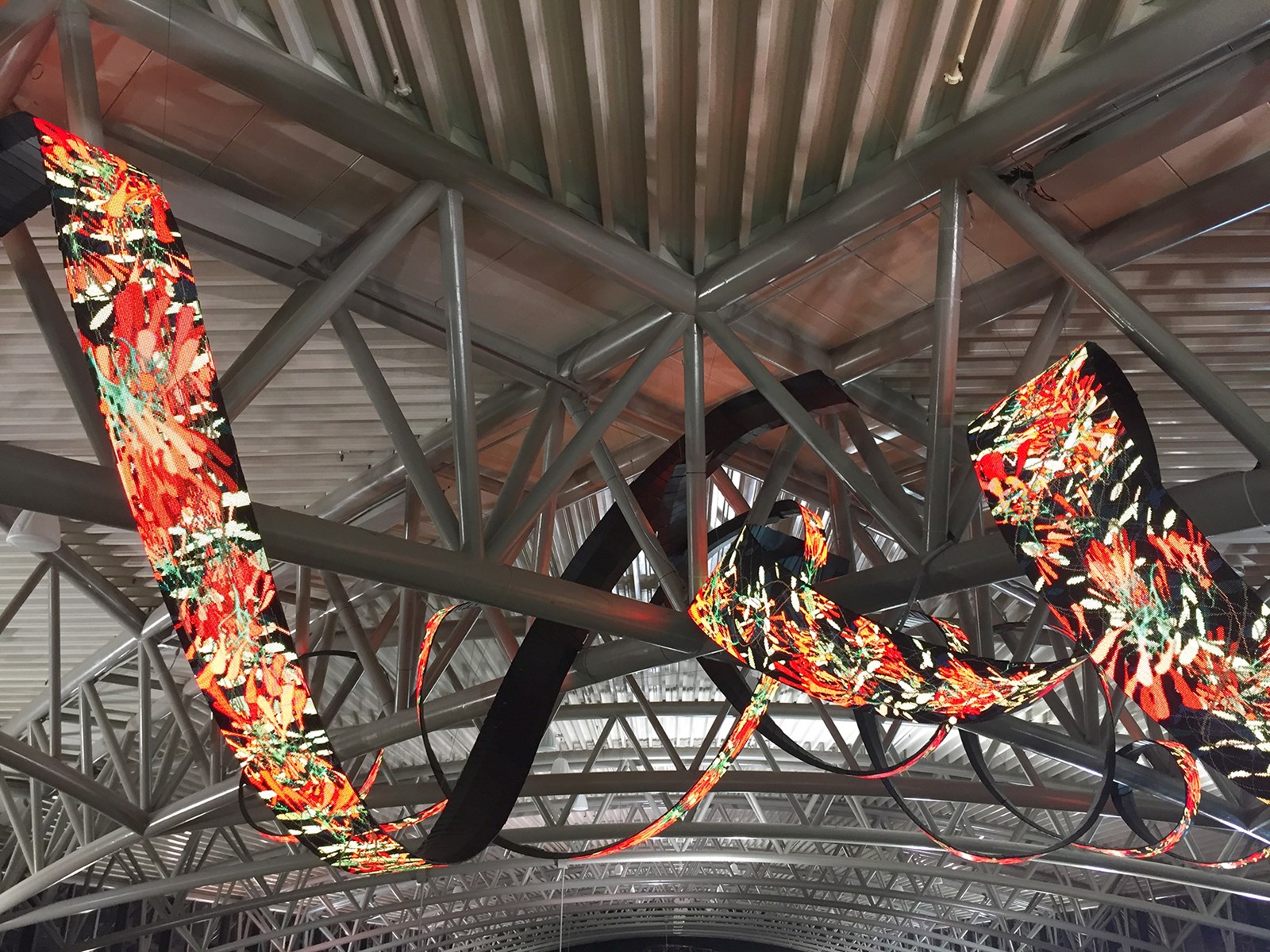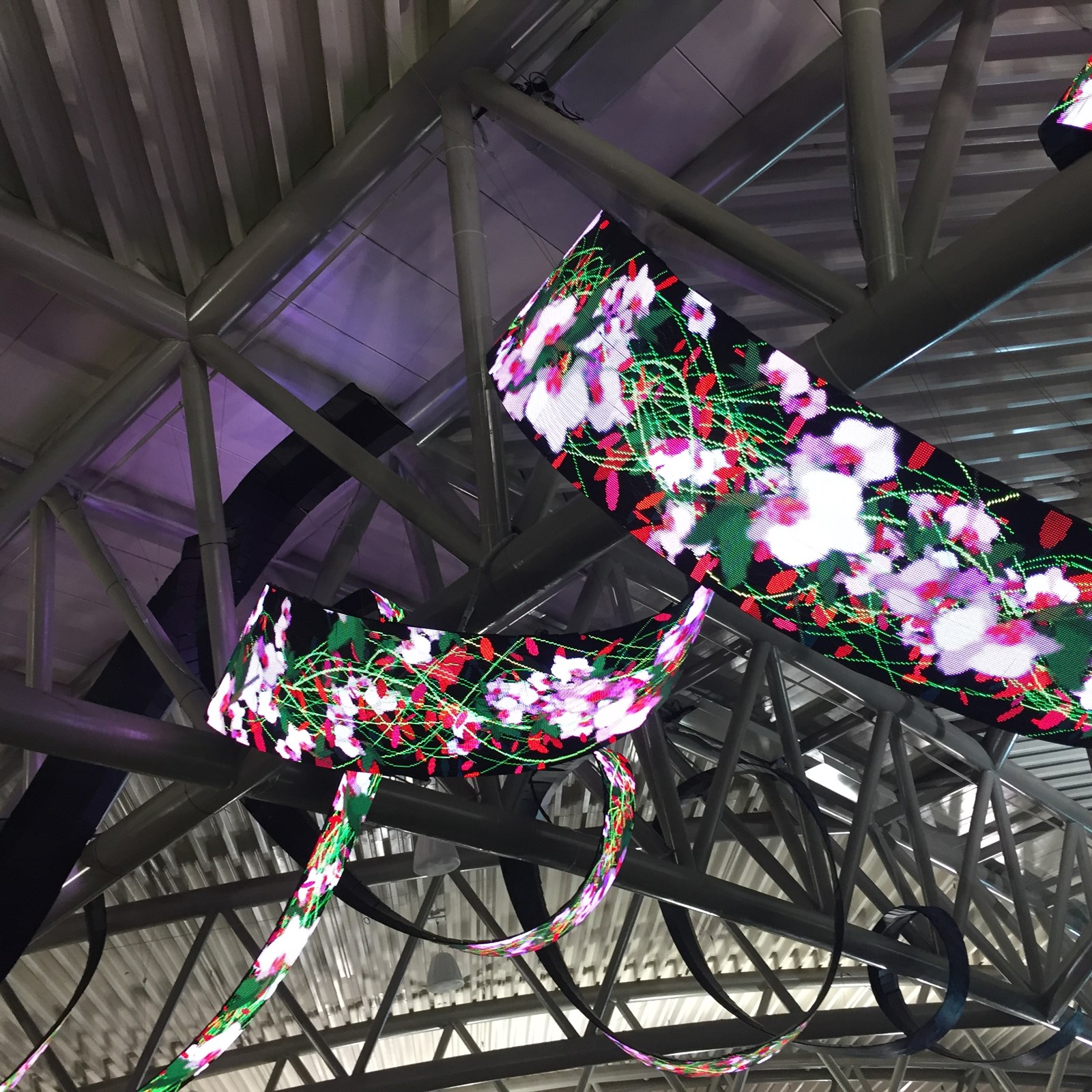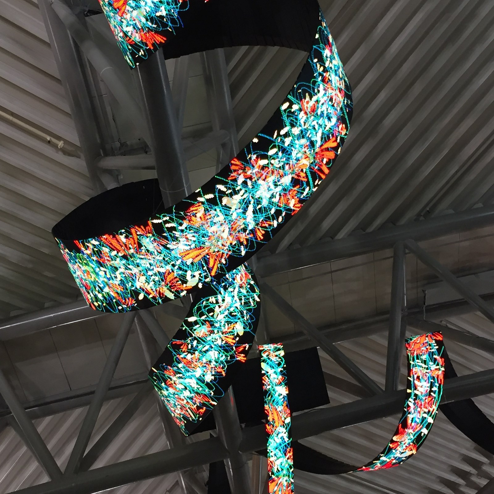 Pantalla flexible de LED, ordenador, programación generativa, datos obtenidos en tiempo real, estructura metálica.
