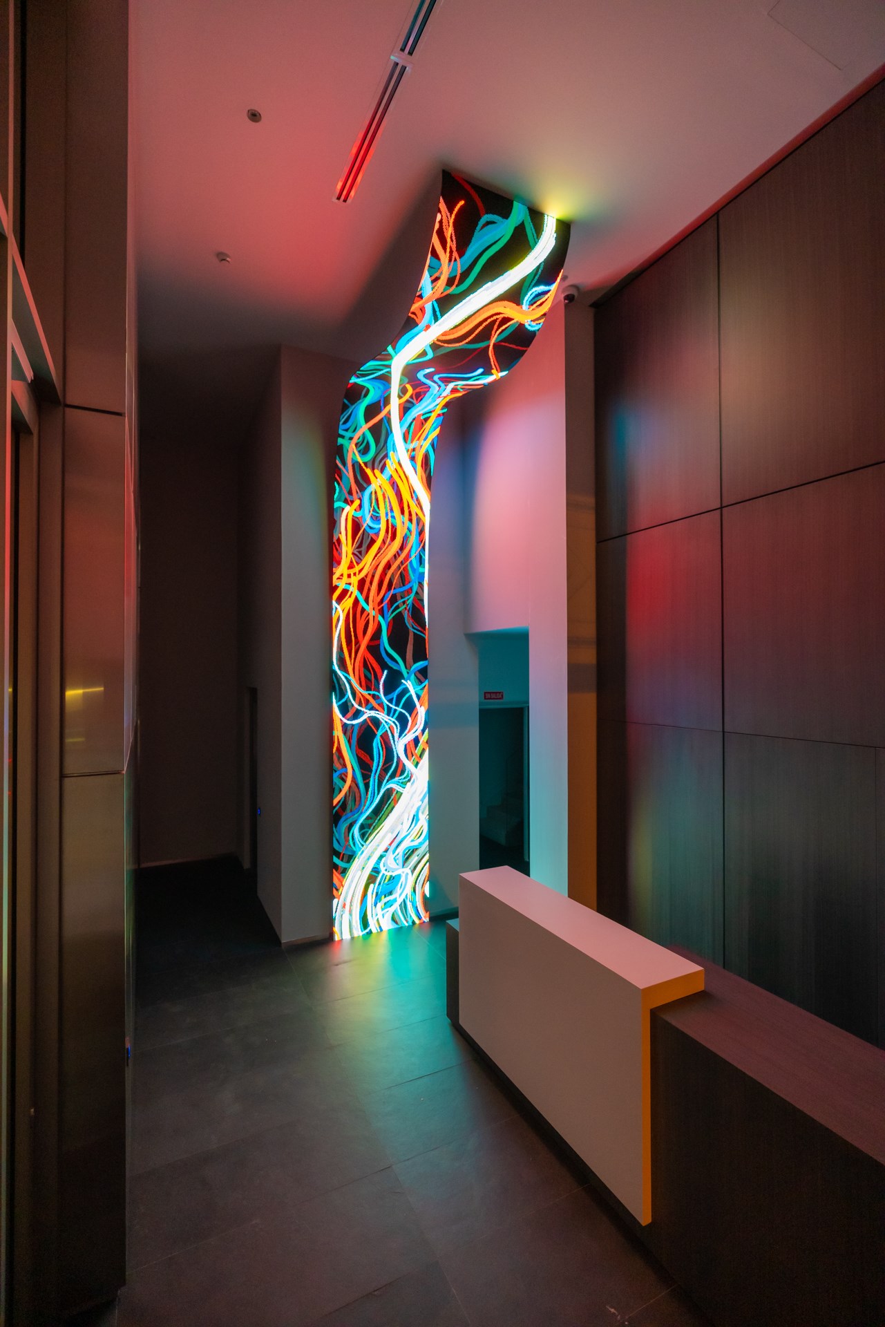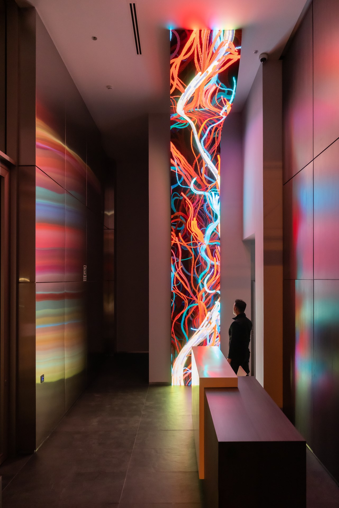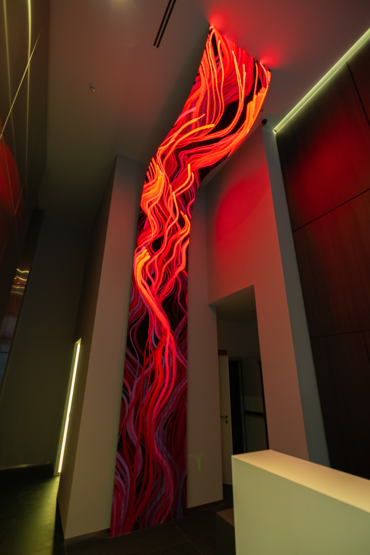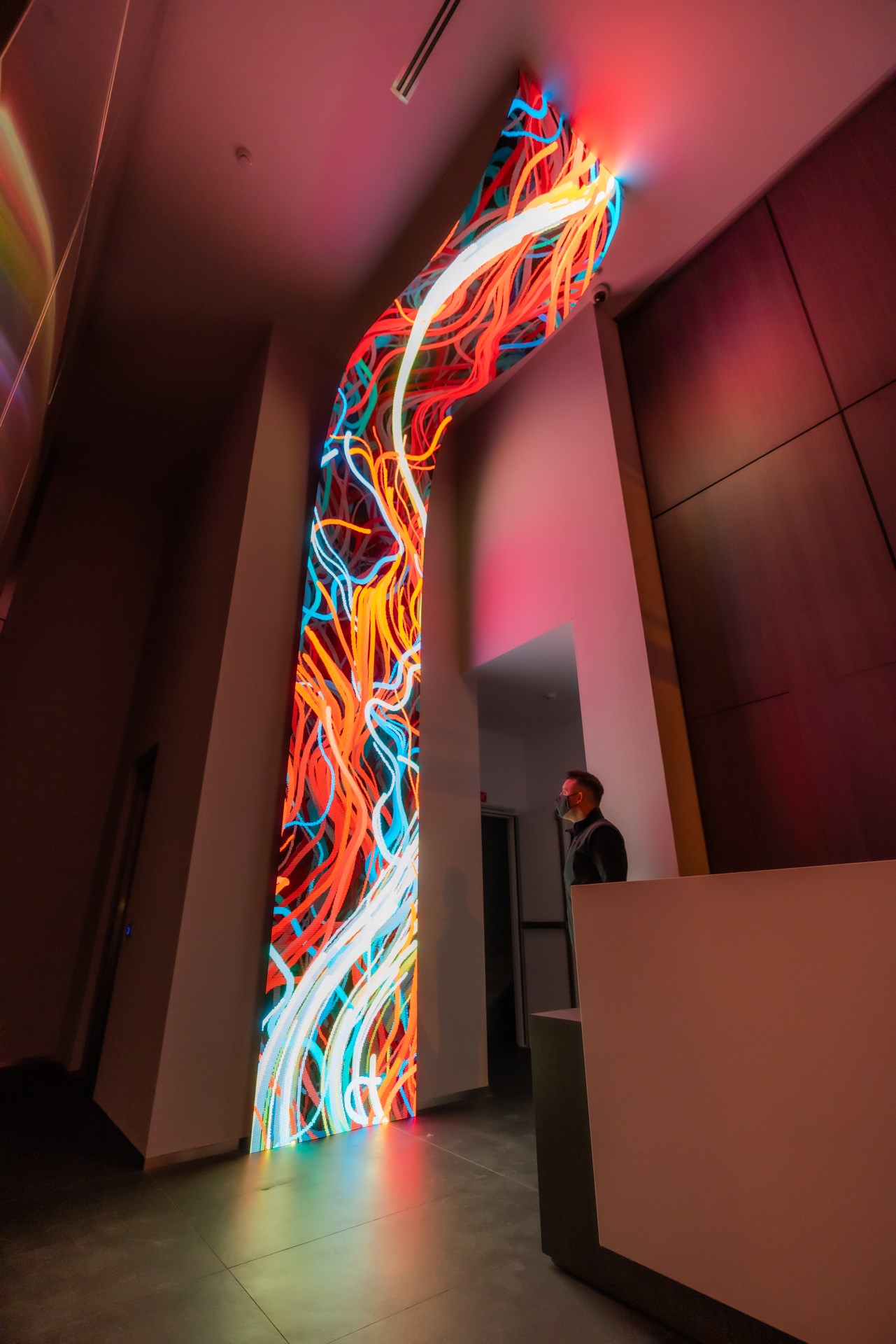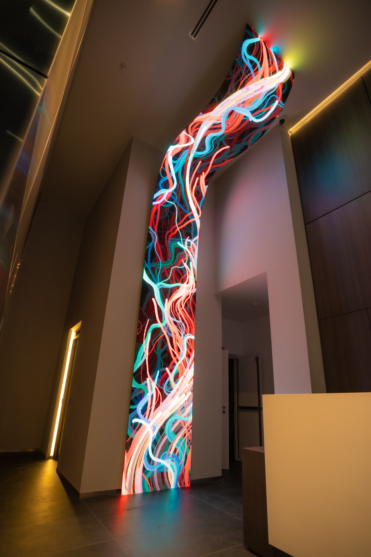 Flexible LED screen, computer, generative custom software, real-time data, metal structure