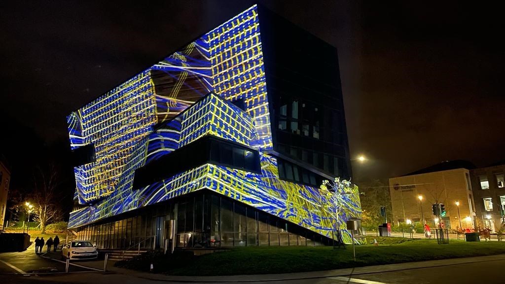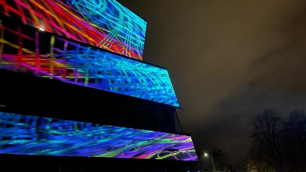 La teoría de cuerdas evoluciona frente a la descripción estándar del universo, al reemplazar toda la materia y las partículas de fuerza con estas cuerdas vibrantes. Aunque esta teoría no se ha explicado ni comprendido completamente, sirve como un modelo interesante para pensar en el universo como una red o tejido interconectado. La teoría general de la relatividad de Einstein hablaba de la naturaleza entretejida del espacio y el tiempo en un tejido único que es continuo, suave y que se curva y deforma con la presencia de materia y energía. Muchos teóricos de cuerdas que se atreven a ir más allá de la teoría clásica de Einstein se han preguntado si el tejido espacial del universo realmente puede rasgarse y desgarrarse. El descubrimiento de que la física cuántica es un reino de violentas turbulencias ha llevado a muchos a pensar que tal vez el tejido espacial se desgarra con regularidad. Universal Loom busca capturar esta actividad cosmológica en el tejido proyectado que envuelve el Ogden Center. Los agujeros negros, las perturbaciones gravitacionales y otras actividades astronómicas tiran y estiran de la tela, creando una interpretación artística de la investigación que se lleva a cabo dentro del edificio.