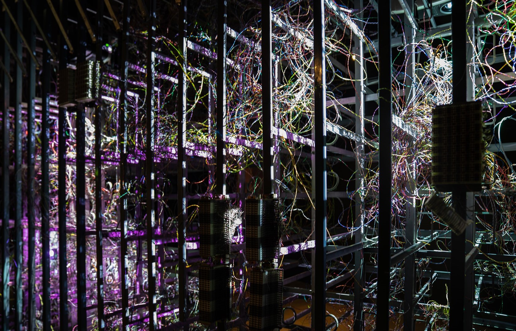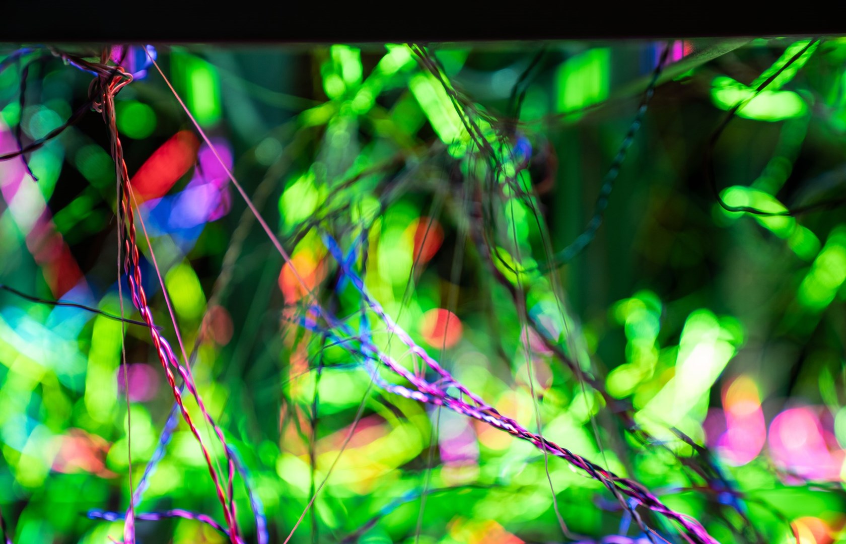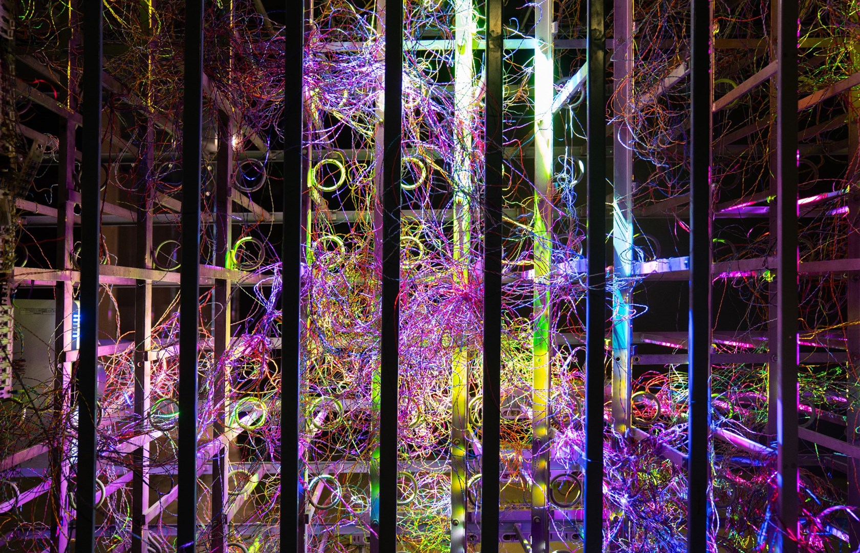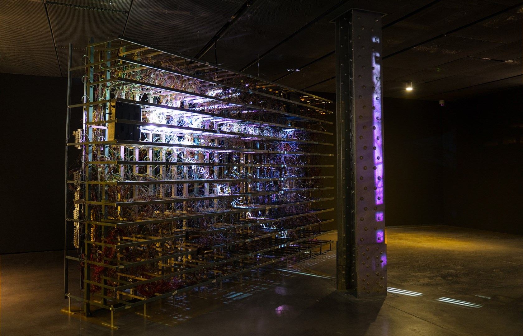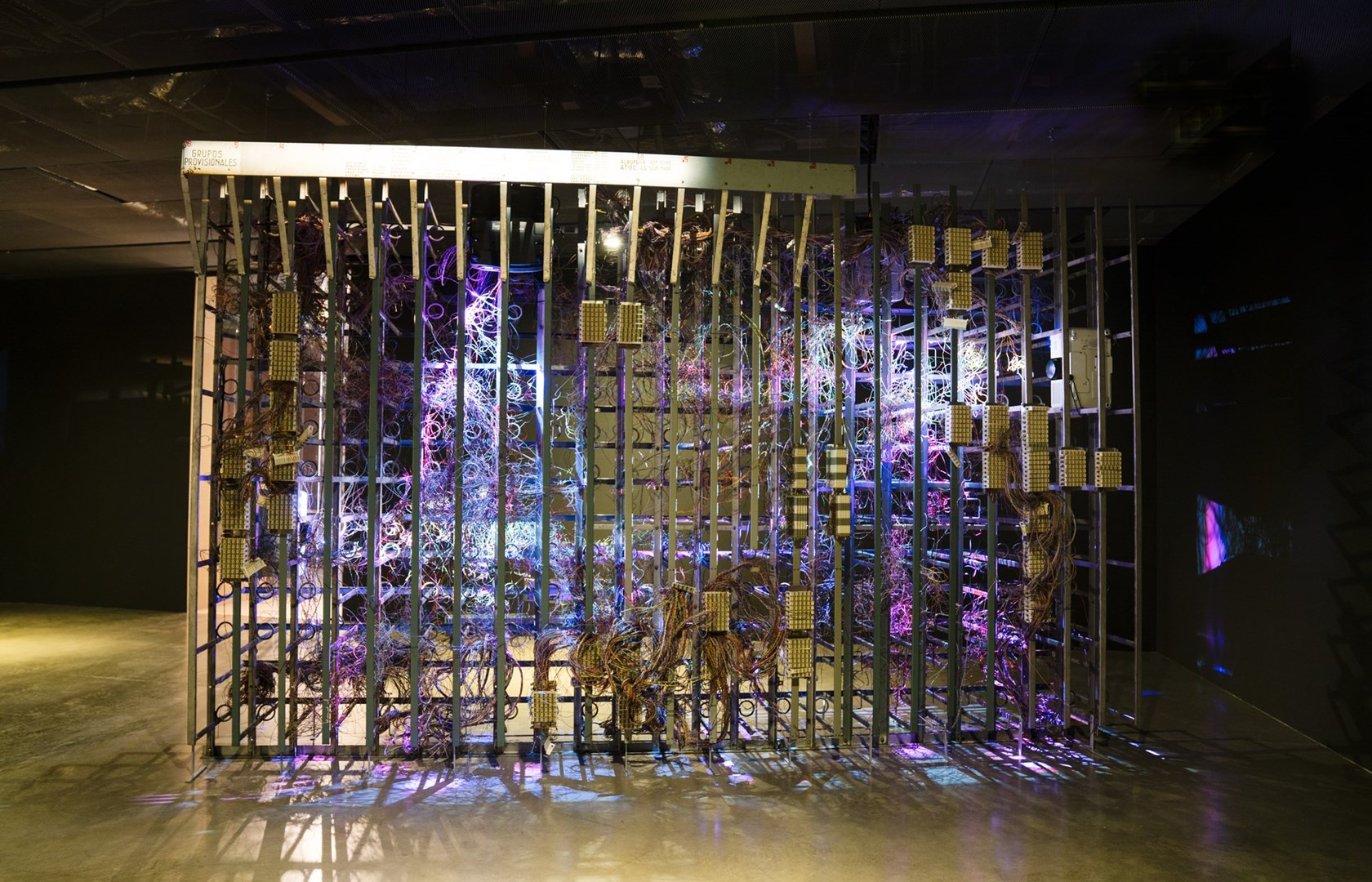 In Intervalos, the metal structures of the old distribution frame have been reassembled by the artist, who has inserted several video projectors between its shelves. Light impulses from the projection travel through chaotic knots of telephone cable, an effect reminiscent of the conversations and information that once ran through this wiring, while suggesting synaptic firing and the global Internet network.