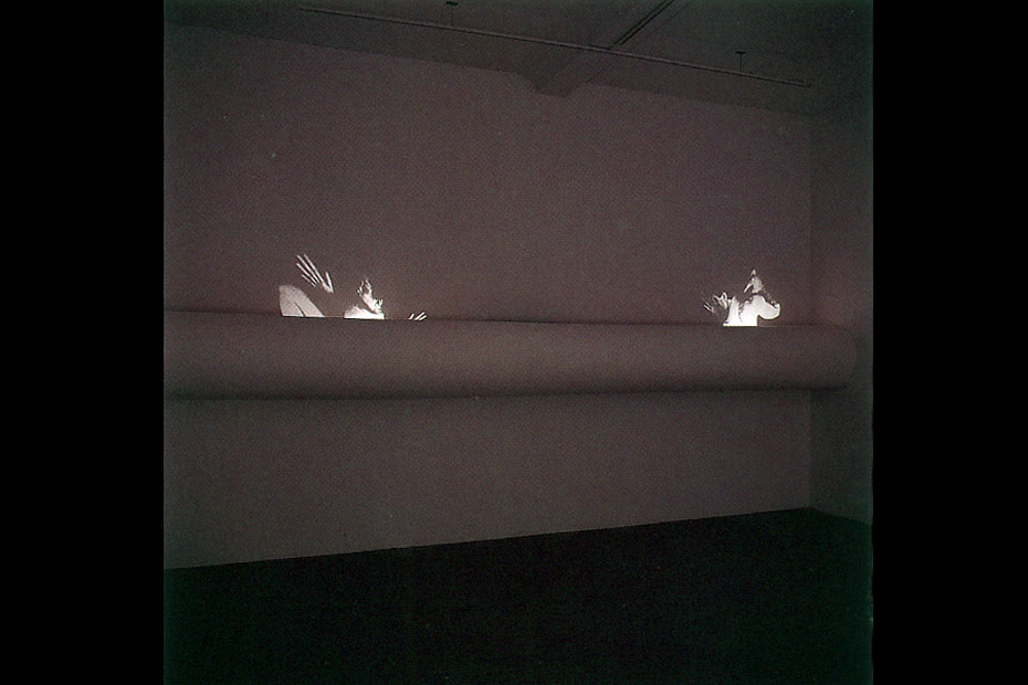 A long panel curls up at its end creating a cylindrical shape. The image is projected from the center of this cylinder. Architecture is a home for the phantom.