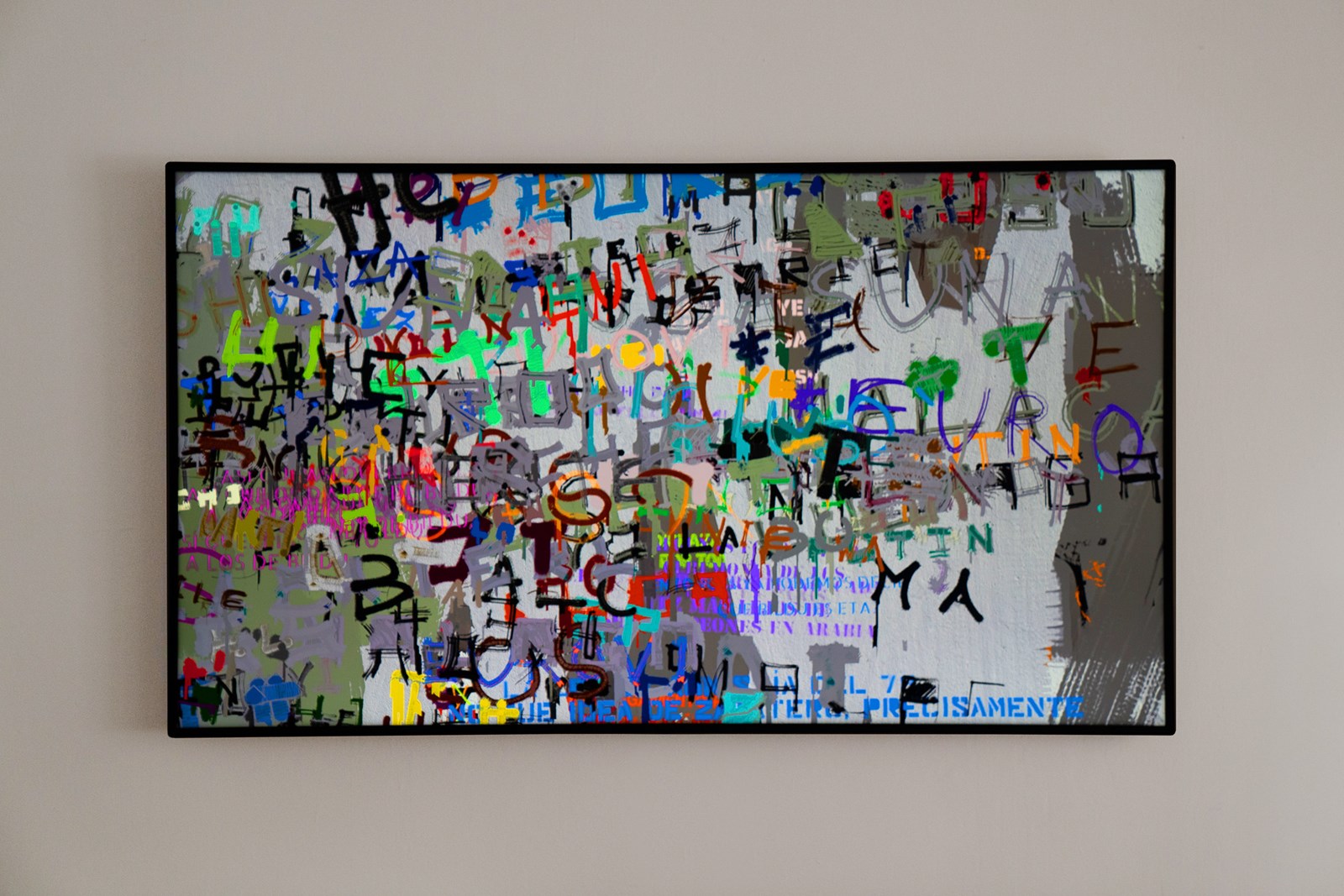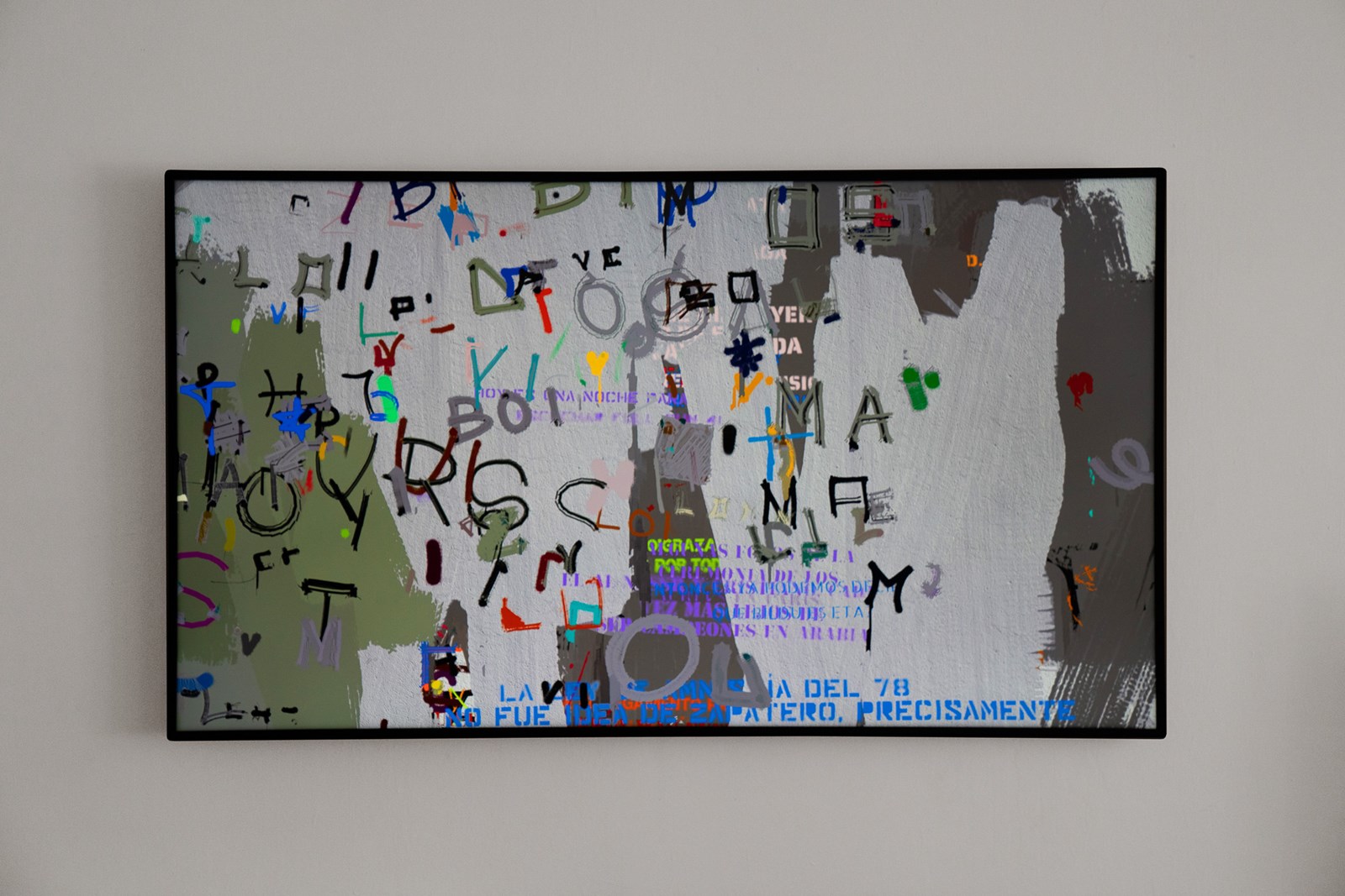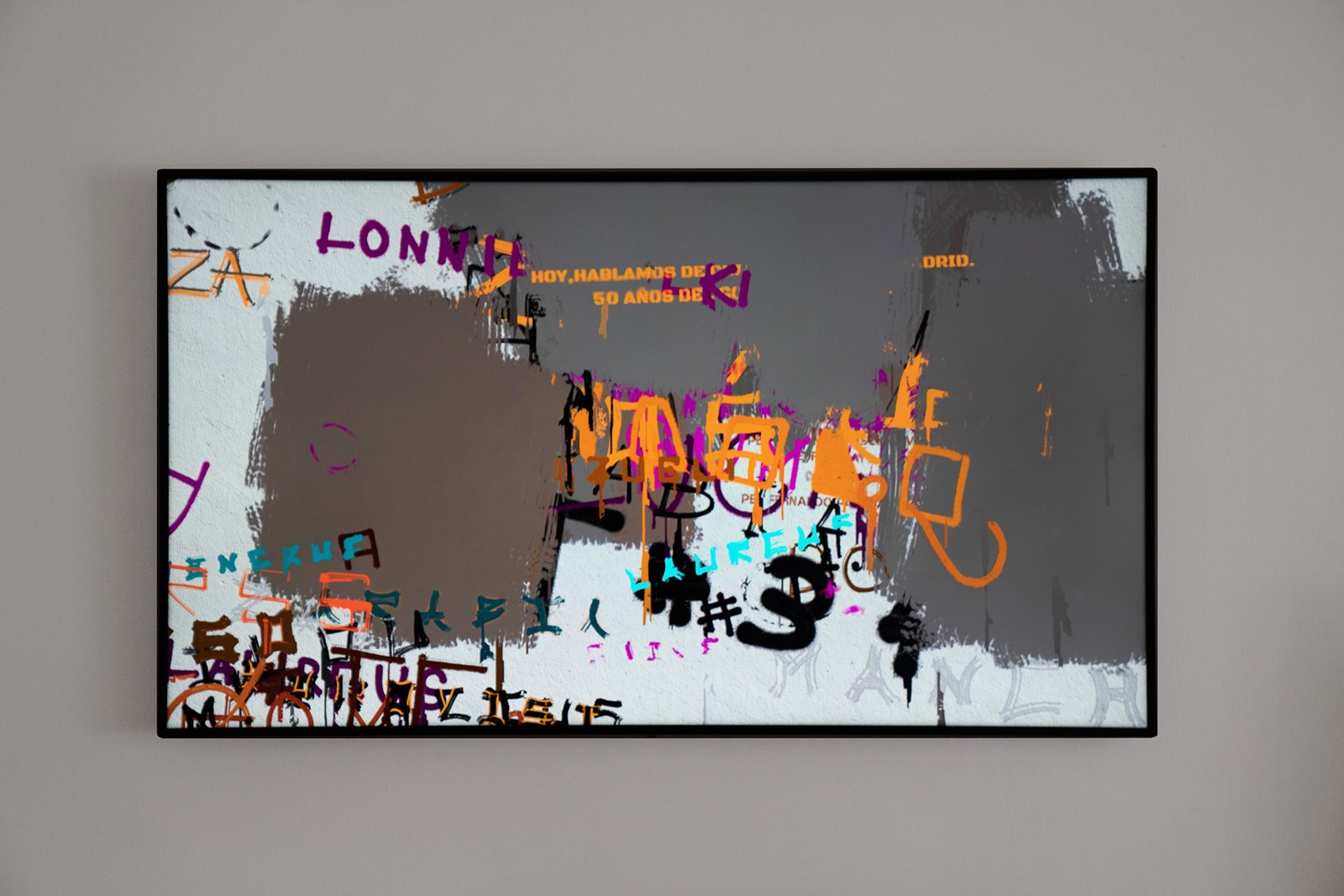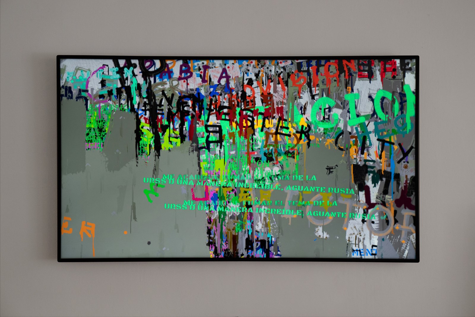 Scrawl’s pace replicates the layers applied to urban walls, where graffiti texts are constantly covered with swaths of flat paint, creating a new canvas for a new succession of graffiti. This effect evokes the struggle between the citizens’ yearning for individual communication and the institutional desire to erase and clean the chaotic world of graffiti. The outcome is an algorithmic piece constantly shifting between the aesthetic of social protest and abstract painting.