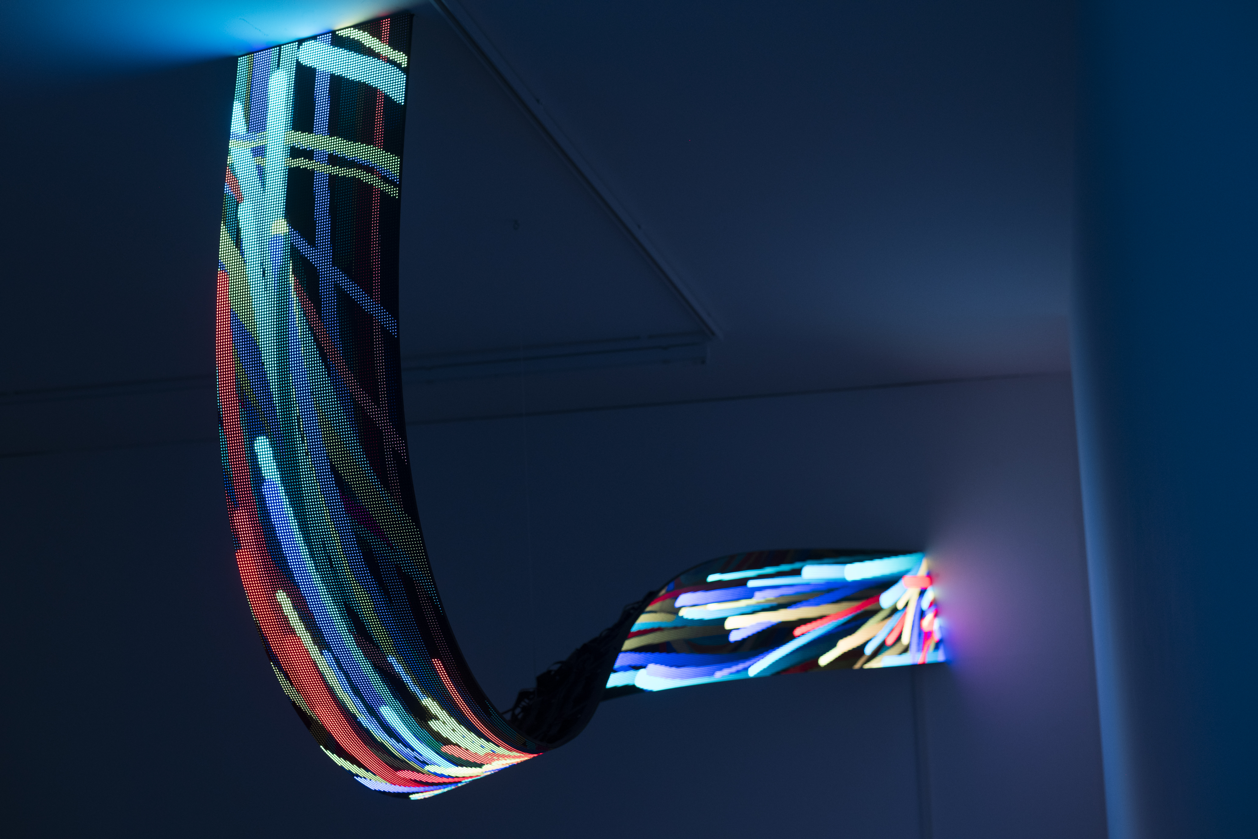 The artworks are ribbon-shaped LED-screens that emerge from the wall with curving gestures and then descend to the floor. The screens become conduits of data related to real-time meteorological information of the city of Geneva, including wind speed, temperature, barometric pressure and humidity. The flow of information is represented via particles that leave trails behind them, creating abstract forms that take the pulse of the city’s activities.