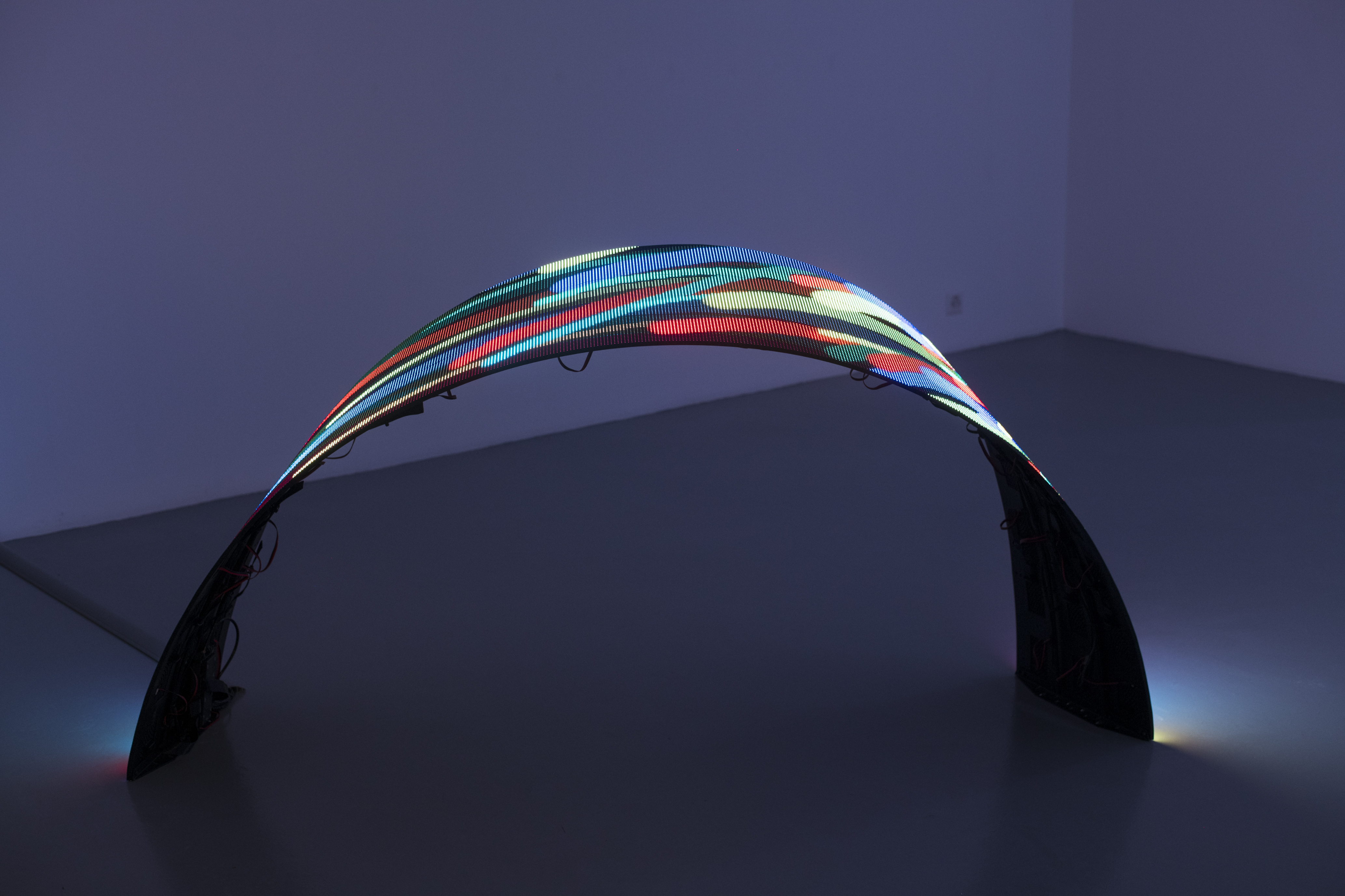Flexible LED screen, computer, generative custom software, real-time data, metal structure