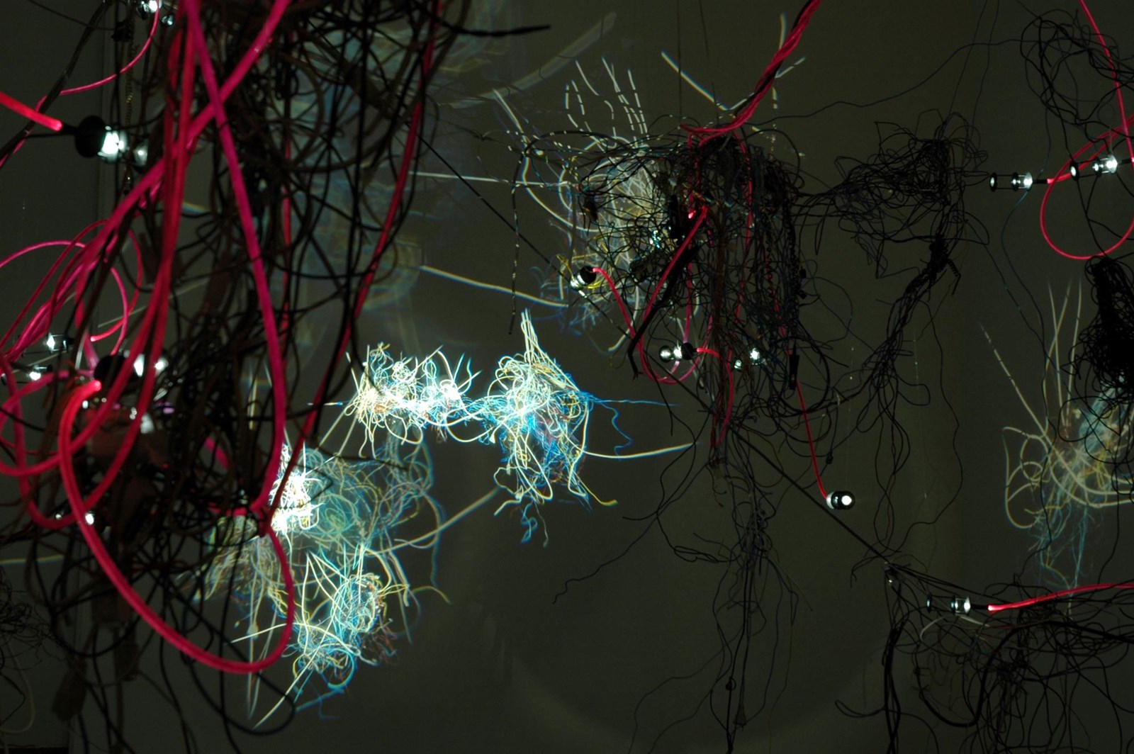 In Tangle the spider's web has been substituted by fiber optic cables as well as electric, computer and telephone cables from Madrid's junkyards. The installation spreads out into the exhibition space and projects images of clusters of cables onto the surrounding walls, and the public’s body. This project is a continuation of the artist's long-term interest in electronic waste and the excesses of consumer society.