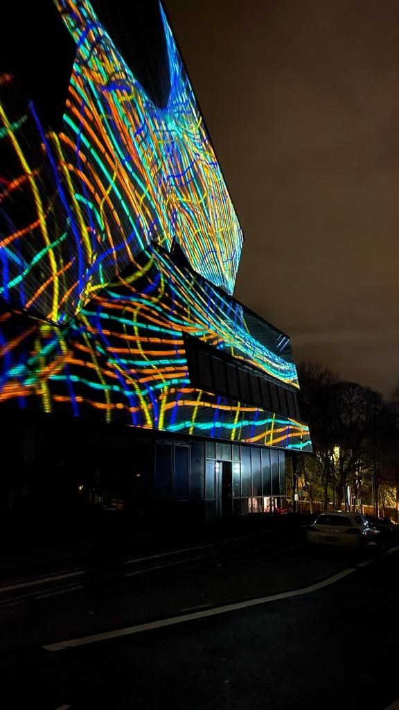 String theory turns the page on the standard description of the universe by replacing all matter and force particles with these vibrating strings. Though this theory has not been fully explained or understood, it serves as an interesting model to think of the universe as an interconnected web or fabric. Einstein’s general theory of relativity spoke about the woven nature of space and time into a single fabric that is continuous, smooth and gets curved and deformed by the presence of matter and energy. Many string theorists who dare to go beyond Einstein’s classical theory have wondered if the spatial fabric of the universe can indeed be ripped and torn. The discovery that quantum physics is a realm of violent turbulence has led many to think that perhaps the spatial fabric rips on a regular basis. Universal Loom attempts to capture this cosmological activity on the projected fabric that wraps around the Ogden Center. Black holes, gravitational disturbances and other astronomical activity pulls and tugs on the fabric, creating an artistic interpretation of the research that happens within the building.