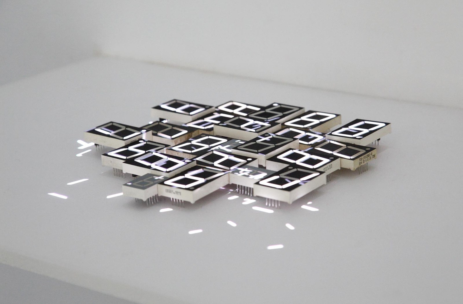 7 is part of the Small Data series. Small Data is composed of a series of salvaged electronic devices (old cell phones, broken computer screens and printers, cracked hard discs, etc.), onto which an overhead projection is cast. The projections, precisely aimed at the devices, animate and seemingly give new life to the abandoned technologies. The artist works like an archeologist, pulling out the found items from piles of discarded materials in junkyards and recycling centers (veritable cemeteries for consumer electronics) and organizes them on shelves as if they were fragile remnants of a bygone era.