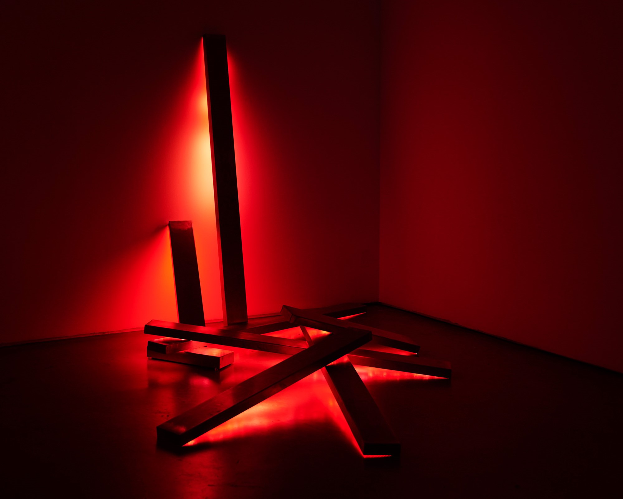 The piece evokes the warmth and intimacy associated with a campfire, while simultaneously highlighting its technological simulation. Formally, the sculpture resembles a collapsing industrial structure. Its fractured form reflects the dismantling of the industrial and the emergence of a new digital order. Simultaneously, it evokes the aesthetics of minimalist sculpture, recalling figures like Carl Andre or Walter De Maria.