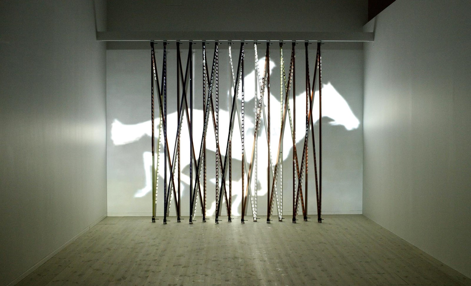 Flicker uses meters of 35 mm film to form a lattice onto which fragments of silver-screen classics are projected. The work explores the passage from analogic to digital media, as well as reconceptualizing Cinema as sculpture.