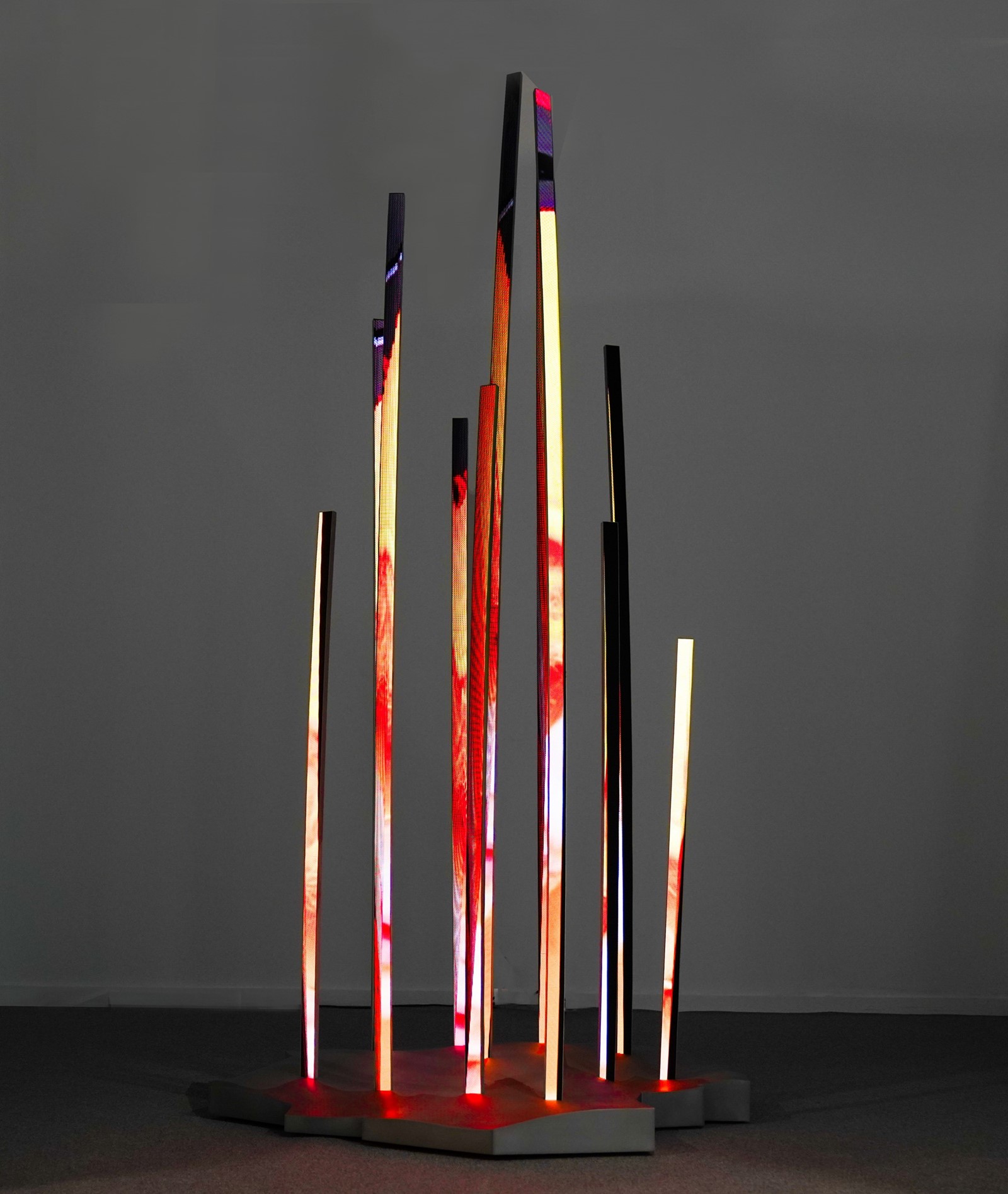 Grove is a sculptural artwork that evokes a cluster of reeds emerging from the ground. The vertically climbing rods are comprised of thin LED screens that feature an abstract animation. The animation becomes alternatively displaced to one side or another on the rods, emerging and disappearing from the thin screens to create an optical effect of swaying motions triggered by wind.