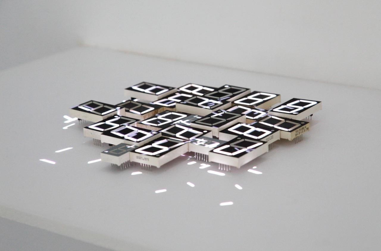 Small Data is composed of a series of salvaged electronic devices (old cell phones, broken computer screens and printers, cracked hard discs, etc.), onto which an overhead projection is cast. The projections, precisely aimed at the devices, animate and seemingly give new life to the abandoned technologies. The artist works like an archeologist, pulling out the found items from piles of discarded materials in junkyards and recycling centers (veritable cemeteries for consumer electronics) and organizes them on shelves as if they were fragile remnants of a bygone era.
