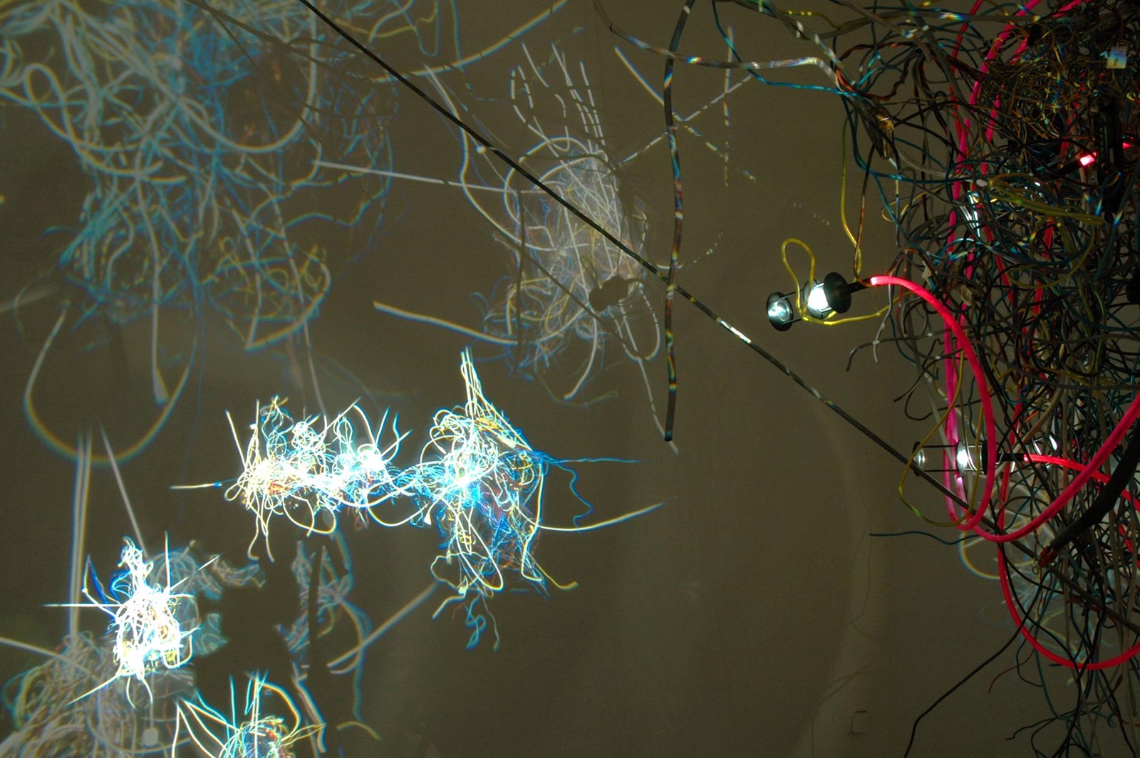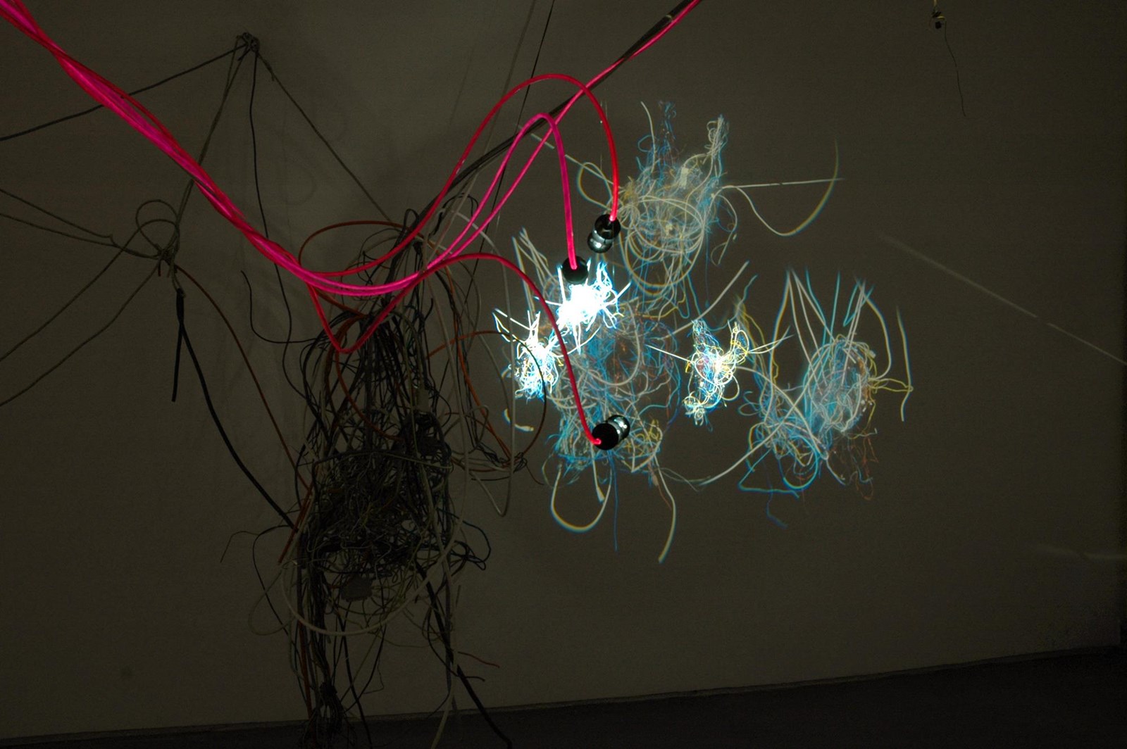 In Tangle the spider's web has been substituted by fiber optic cables as well as electric, computer and telephone cables from Madrid's junkyards. The installation spreads out into the exhibition space and projects images of clusters of cables onto the surrounding walls, and the public’s body. This project is a continuation of the artist's long-term interest in electronic waste and the excesses of consumer society.