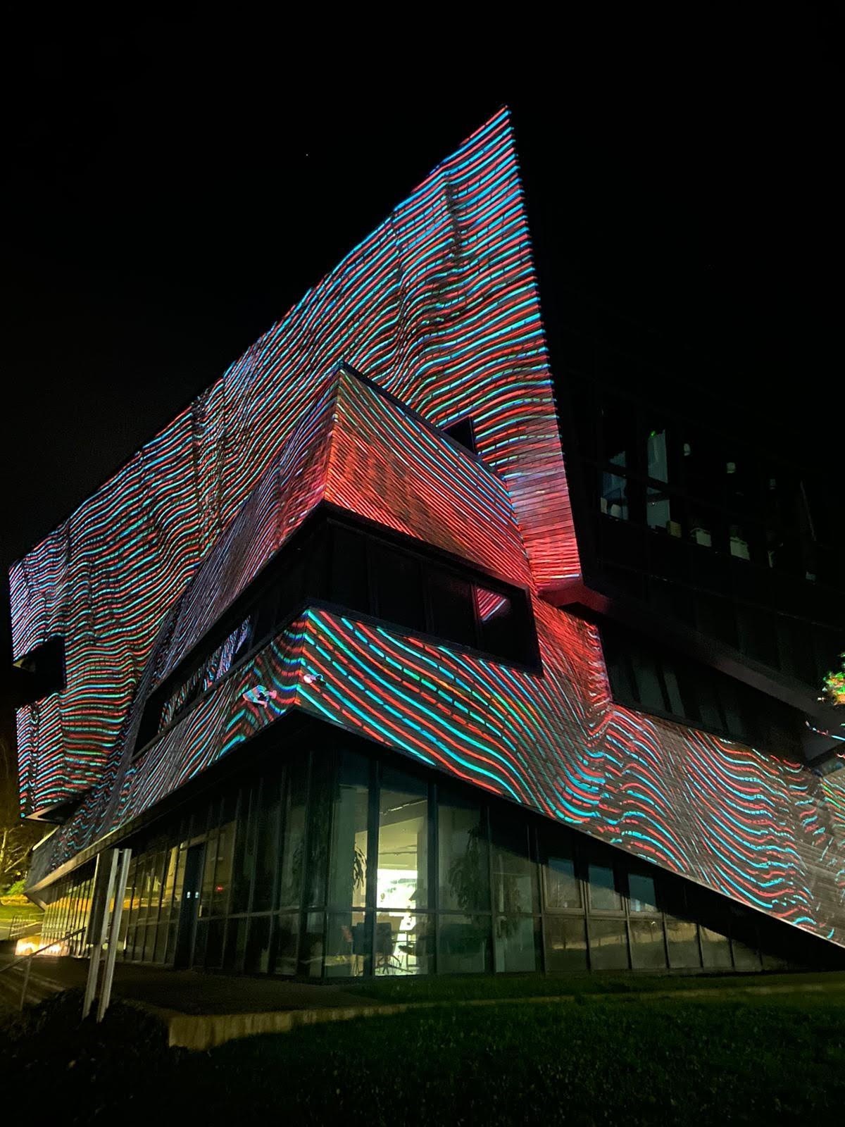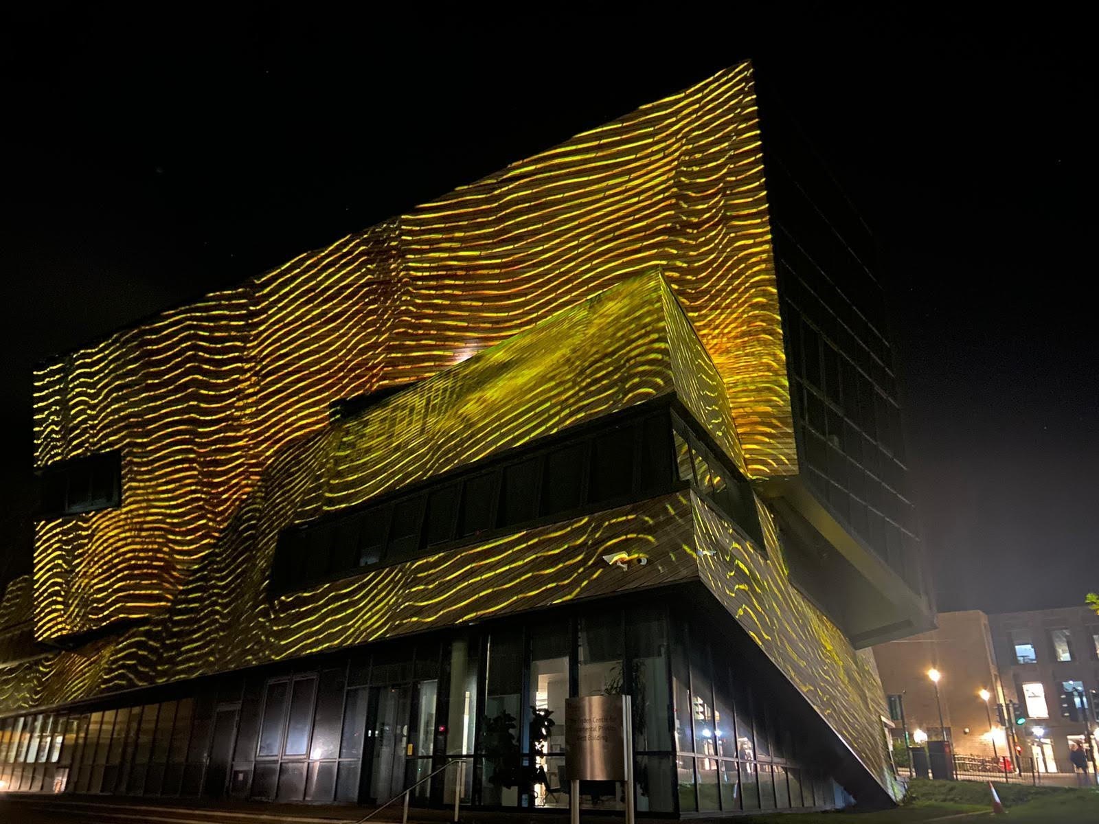 String theory turns the page on the standard description of the universe by replacing all matter and force particles with these vibrating strings. Though this theory has not been fully explained or understood, it serves as an interesting model to think of the universe as an interconnected web or fabric. Einstein’s general theory of relativity spoke about the woven nature of space and time into a single fabric that is continuous, smooth and gets curved and deformed by the presence of matter and energy. Many string theorists who dare to go beyond Einstein’s classical theory have wondered if the spatial fabric of the universe can indeed be ripped and torn. The discovery that quantum physics is a realm of violent turbulence has led many to think that perhaps the spatial fabric rips on a regular basis. Universal Loom attempts to capture this cosmological activity on the projected fabric that wraps around the Ogden Center. Black holes, gravitational disturbances and other astronomical activity pulls and tugs on the fabric, creating an artistic interpretation of the research that happens within the building.