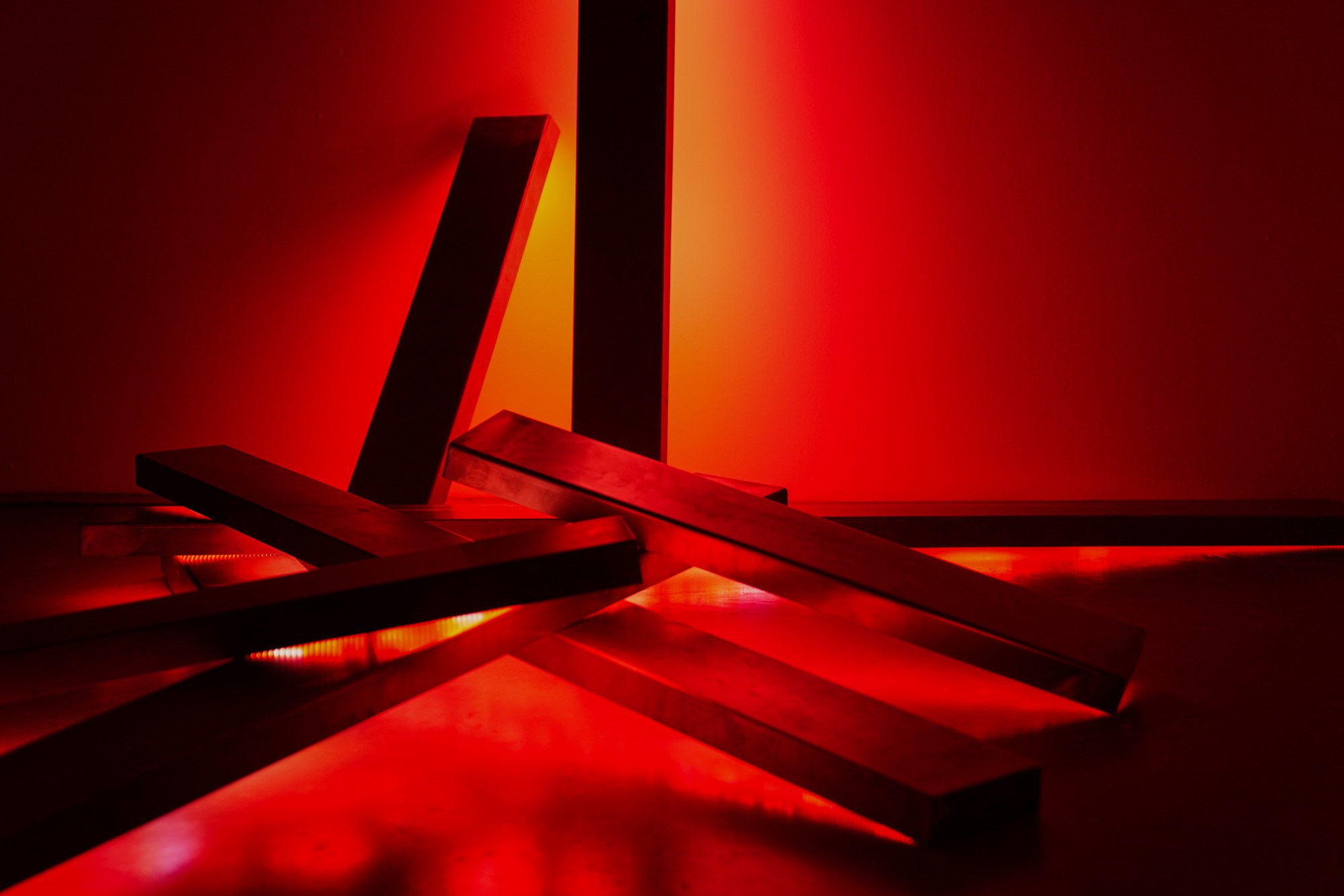 La pieza evoca la calidez y la intimidad del fuego de campamento, al tiempo que subraya su condición de simulacro tecnológico. Formalmente, la escultura recuerda a una estructura industrial en colapso. Su forma fracturada refleja el desmantelamiento de lo industrial y la aparición de un nuevo orden digital. A la vez, evoca la estética de la escultura minimalista, remitiendo a figuras como Carl Andre o Walter De Maria.