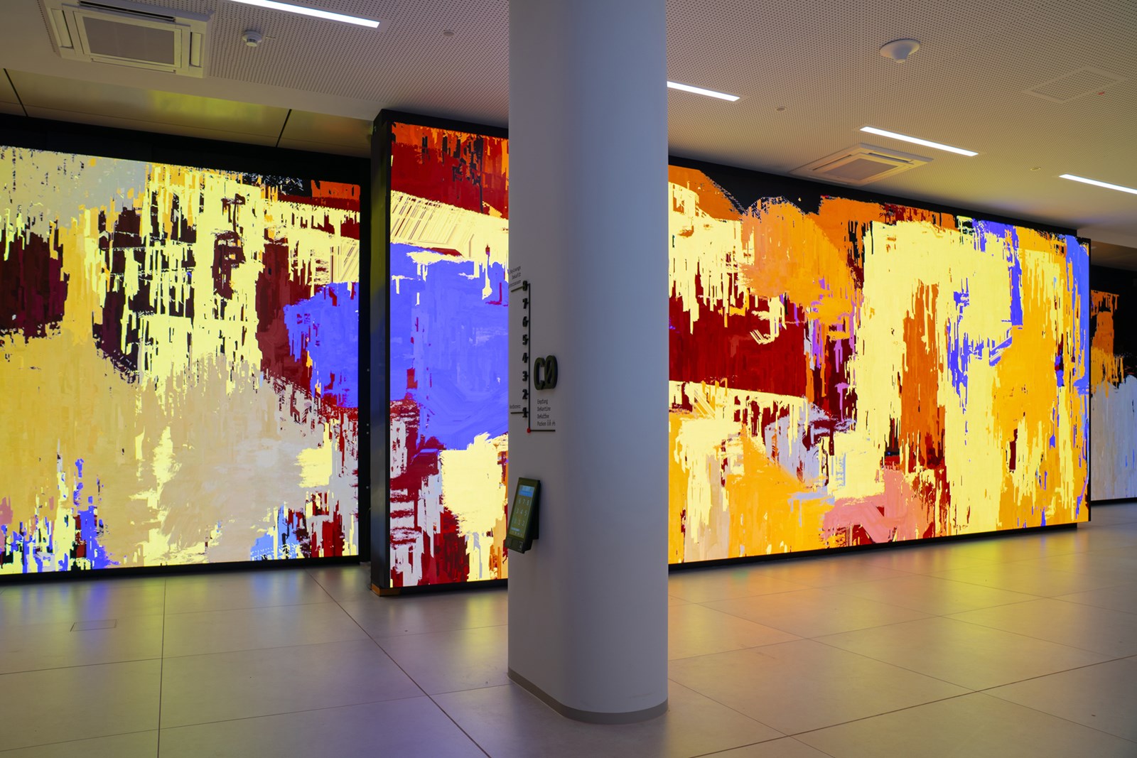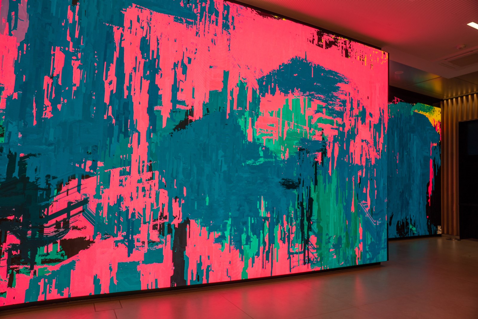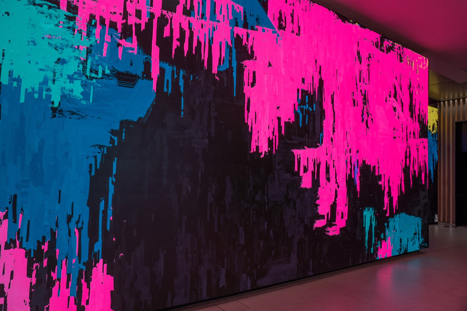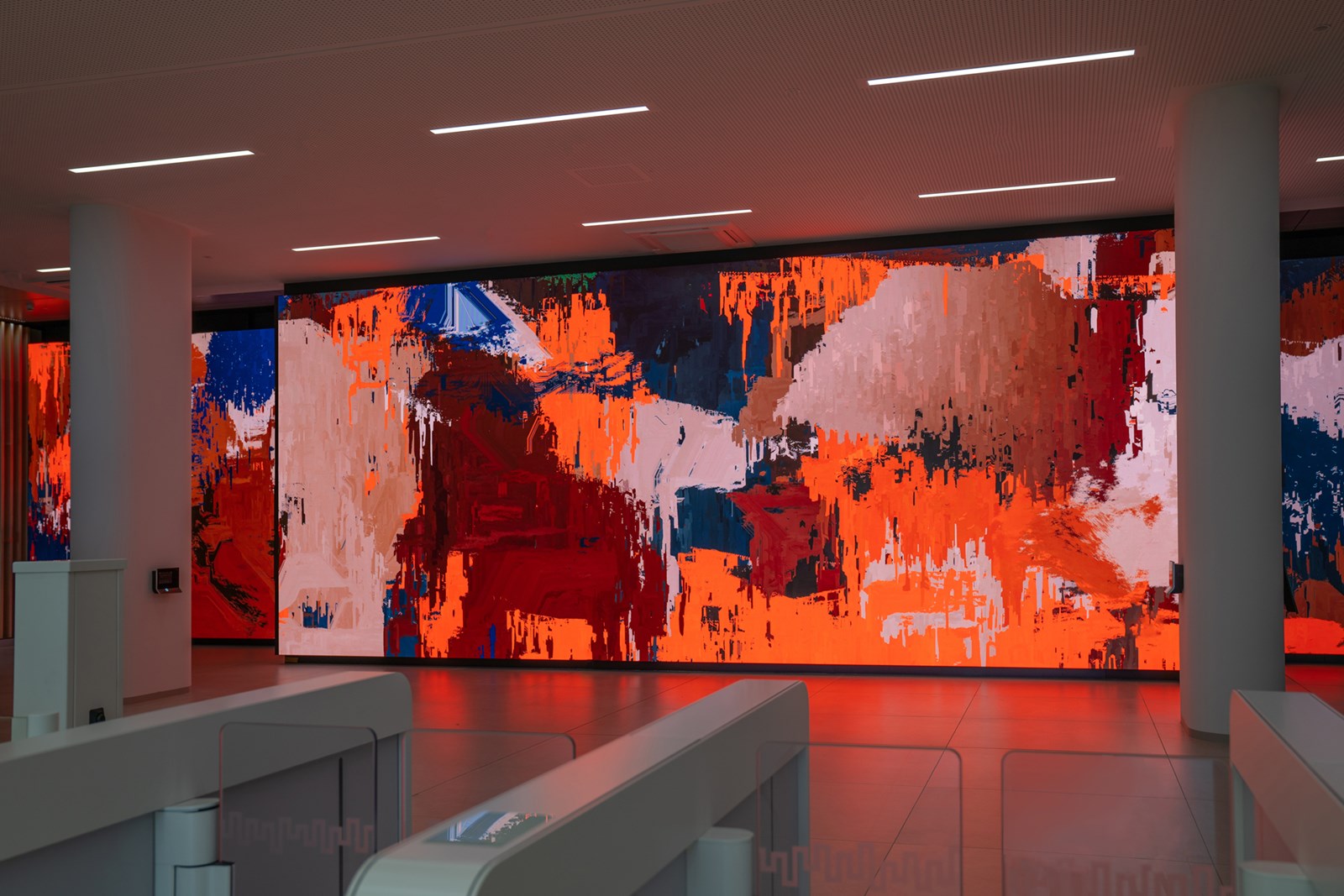 Cuatro webcams ubicadas estratégicamente en el lobby capturan el movimiento de los empleados y visitantes conforme pasan por delante de la pantalla LED. Sus movimientos se transforman en manchas de color que aparecen en la obra con colores saturados y brillantes. Estas formas gráficas y brillantes ayudan a interpretar las pinceladas generadas por el movimiento del público, en contraposición a aquellas generadas por el algoritmo, que tienden a ser más irregulares.