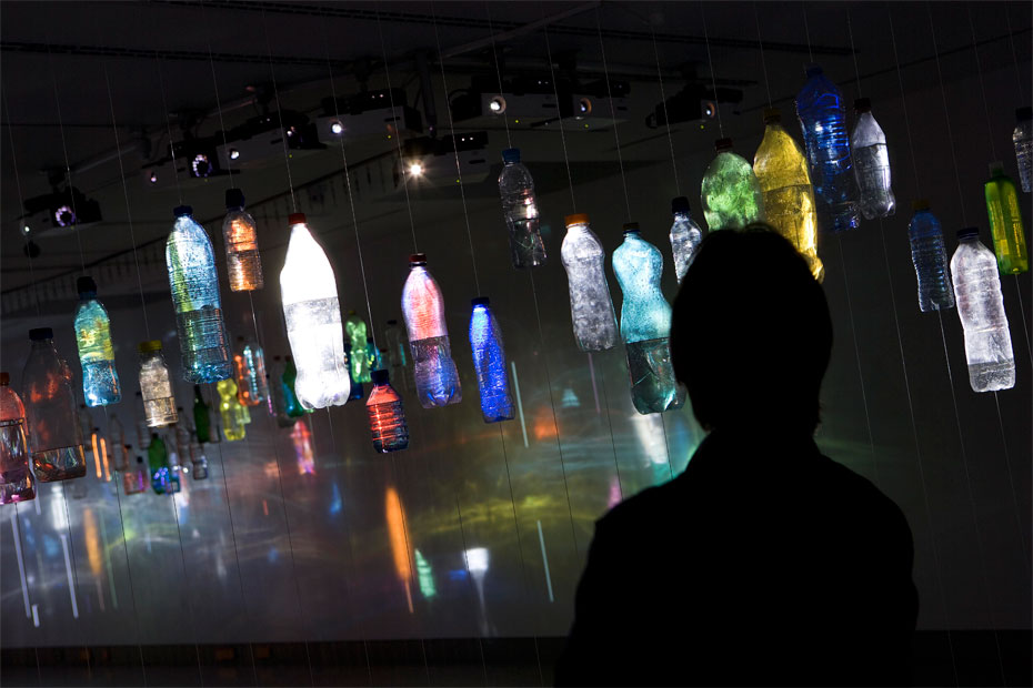 Medio: Agua, 180 botellas de plástico reutilizadas, 180 pesas de hierro, hilo de