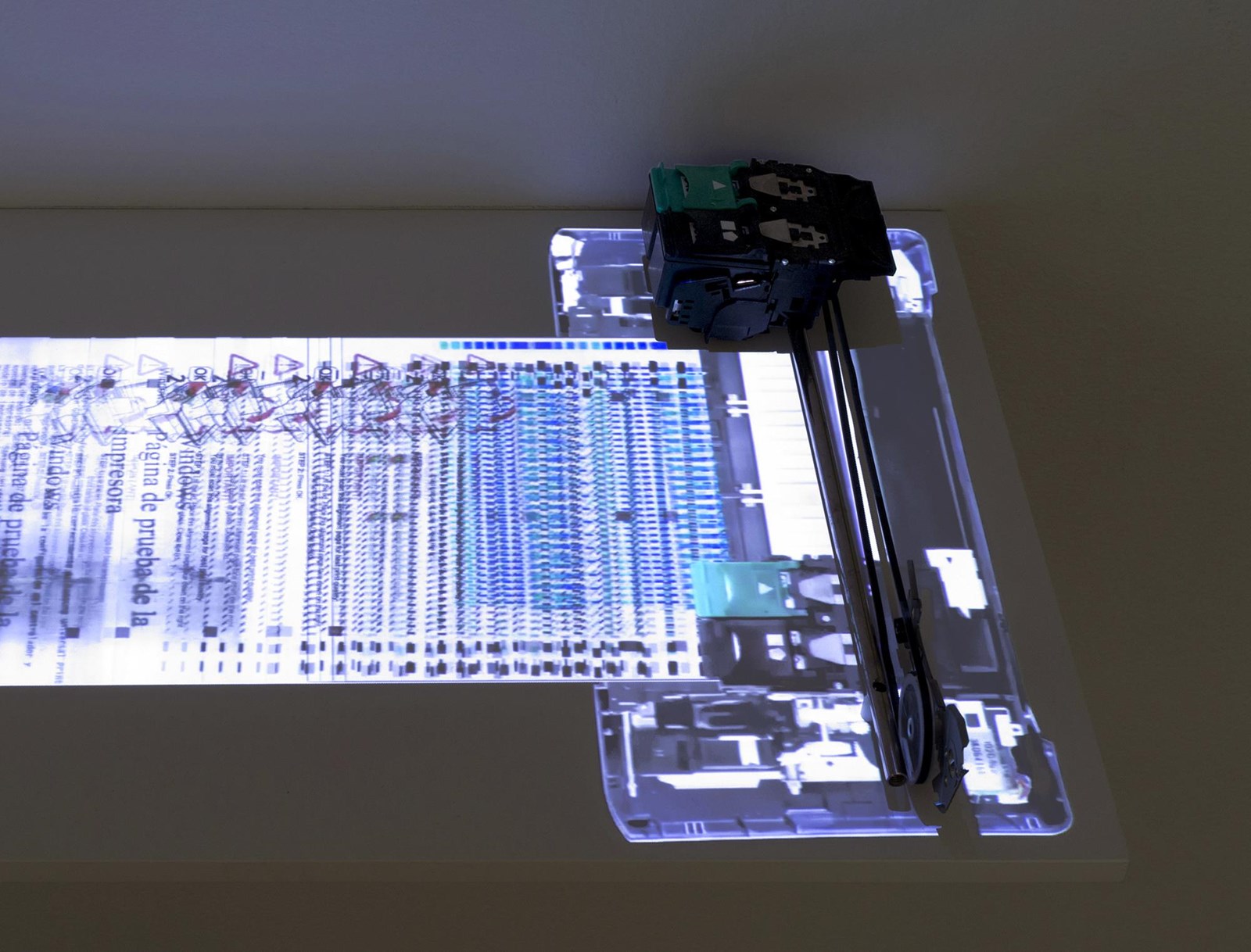 Medium: Discarded printer parts, wooden shelf, projector and MicroSD memory