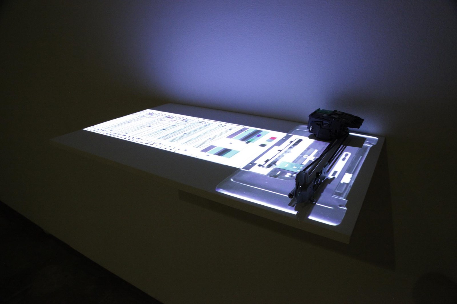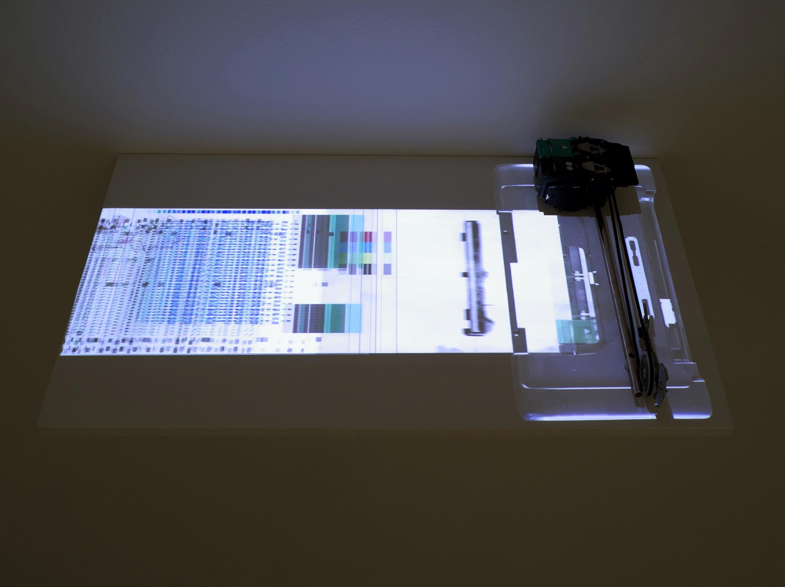 CMYK is part of the Small Data series. Small Data is composed of a series of salvaged electronic devices (old cell phones, broken computer screens and printers, cracked hard discs, etc.), onto which an overhead projection is cast. The projections, precisely aimed at the devices, animate and seemingly give new life to the abandoned technologies. The artist works like an archeologist, pulling out the found items from piles of discarded materials in junkyards and recycling centers (veritable cemeteries for consumer electronics) and organizes them on shelves as if they were fragile remnants of a bygone era.