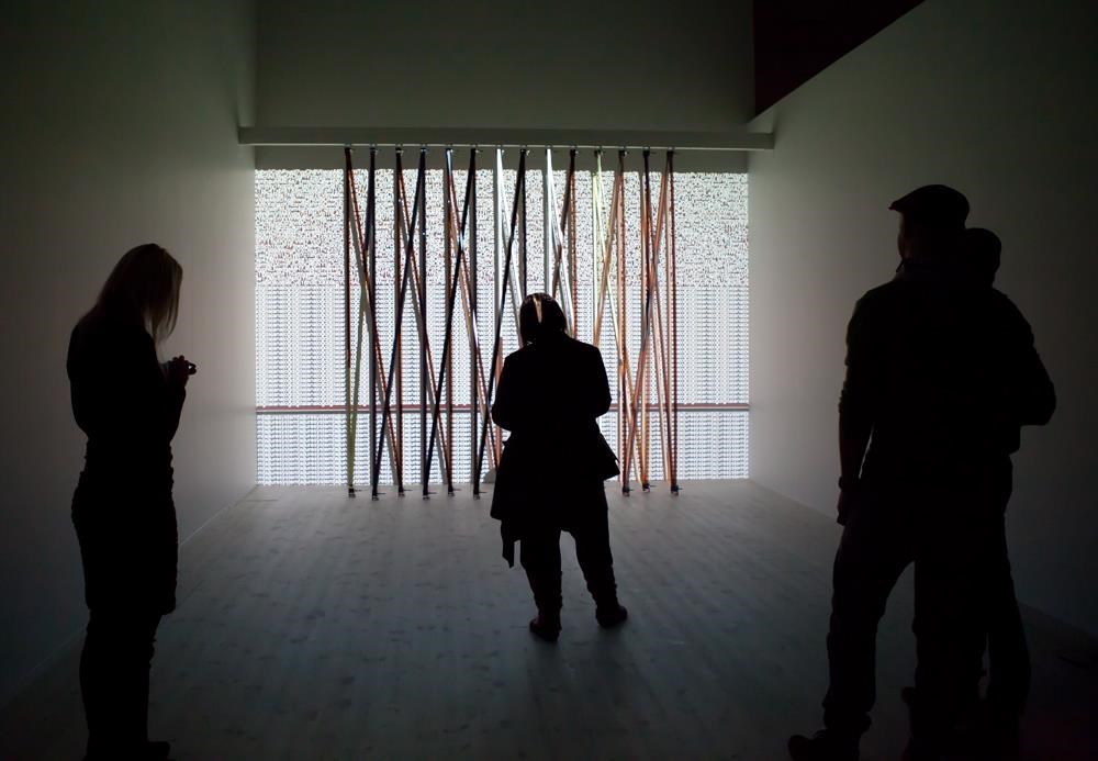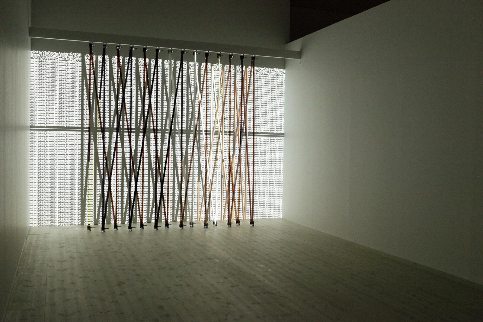 Flicker uses meters of 35 mm film to form a lattice onto which fragments of silver-screen classics are projected. The work explores the passage from analogic to digital media, as well as reconceptualizing Cinema as sculpture.