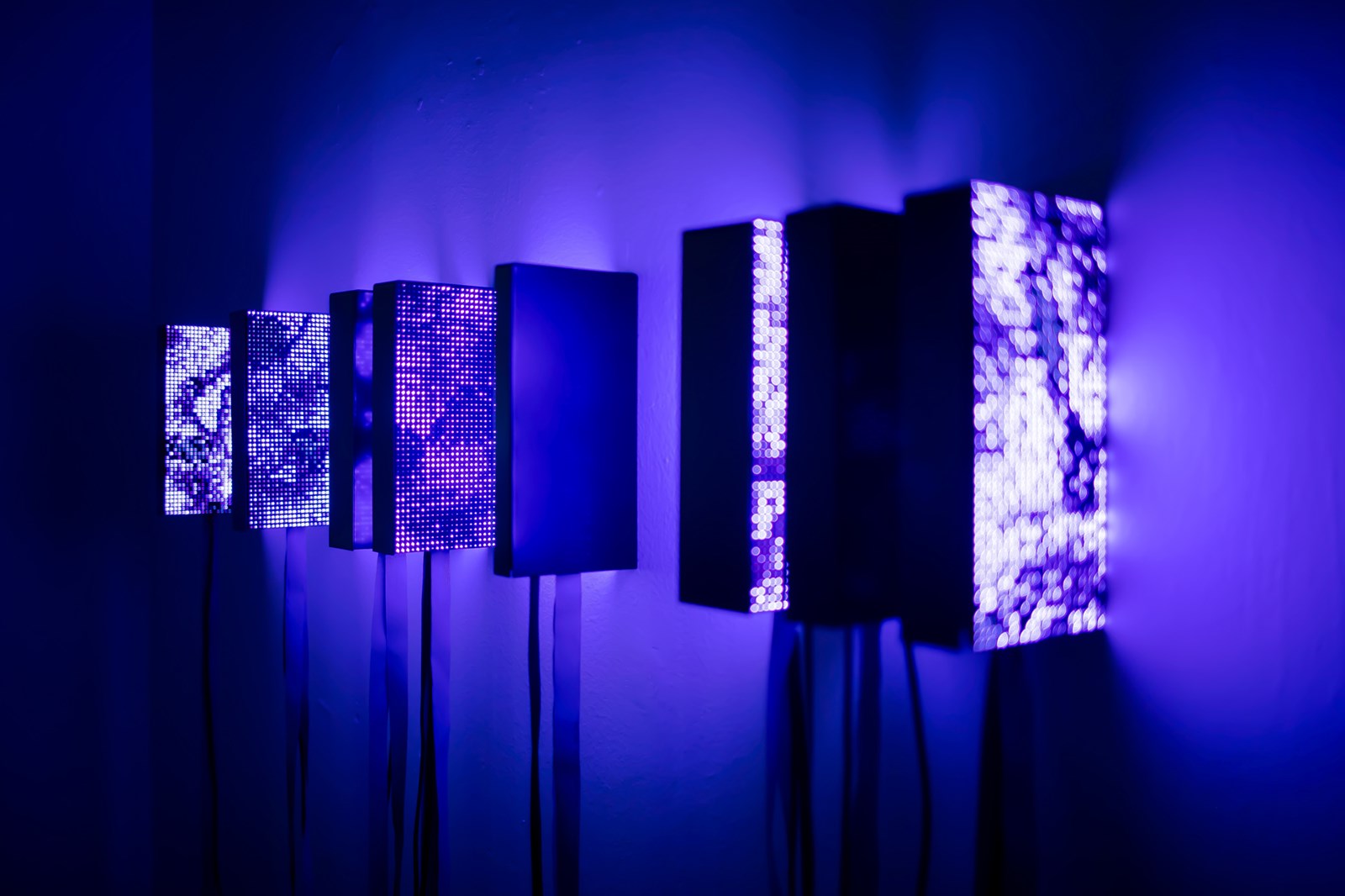 Like the life of a cell, the content is totally autonomous in its form and evolution as it is in constant communication with its surroundings. In fact, the activity of these screens projects different lights, whose chromatic contamination converses freely, escaping beyond the physical limits of each module.