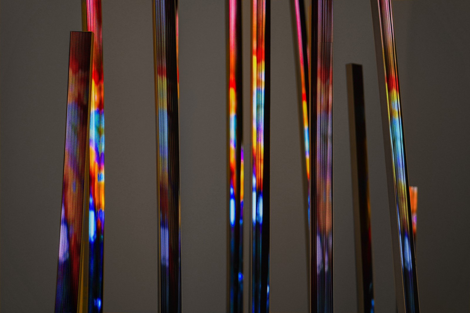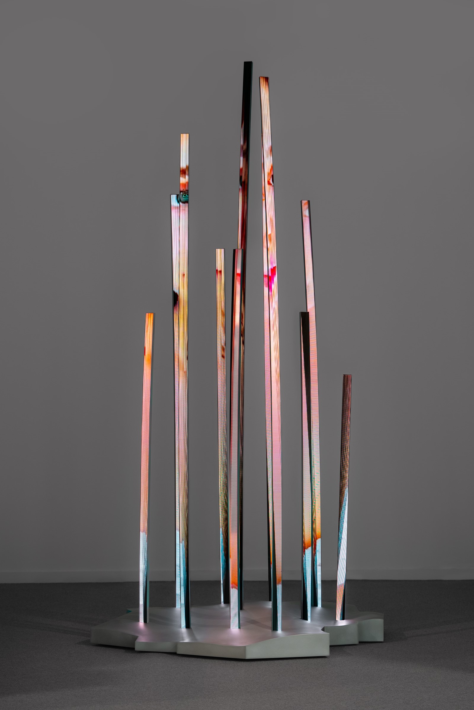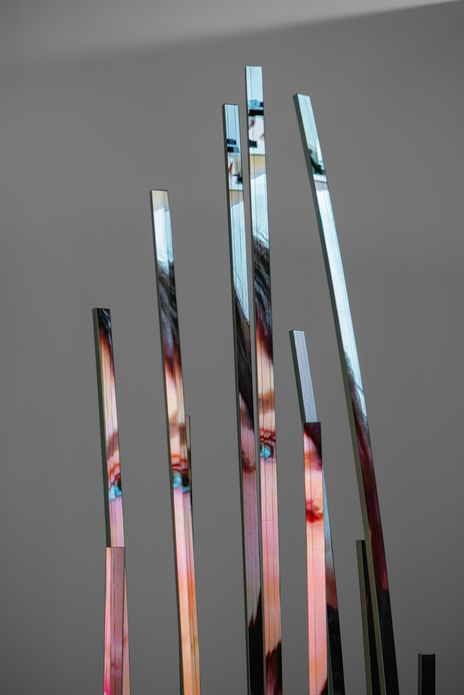 Grove is a sculptural artwork that evokes a cluster of reeds emerging from the ground. The vertically climbing rods are comprised of thin LED screens that feature an abstract animation. The animation becomes alternatively displaced to one side or another on the rods, emerging and disappearing from the thin screens to create an optical effect of swaying motions triggered by wind.