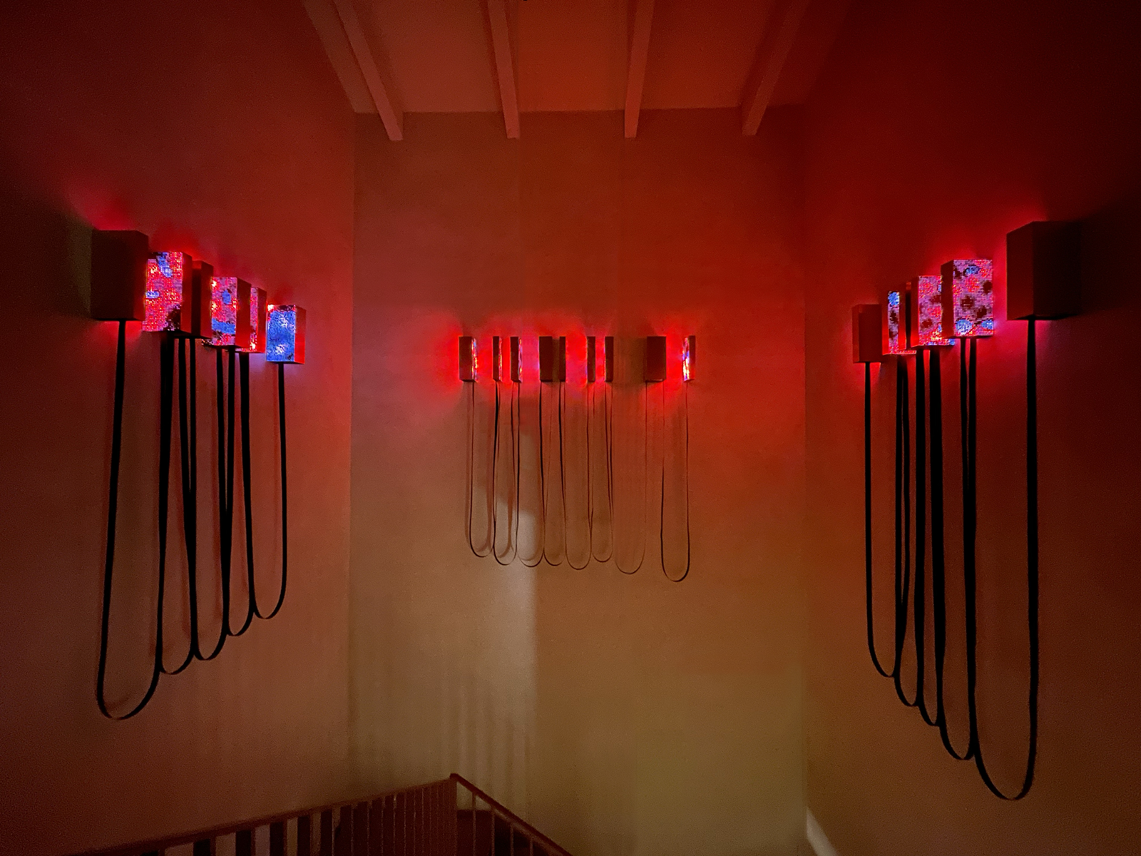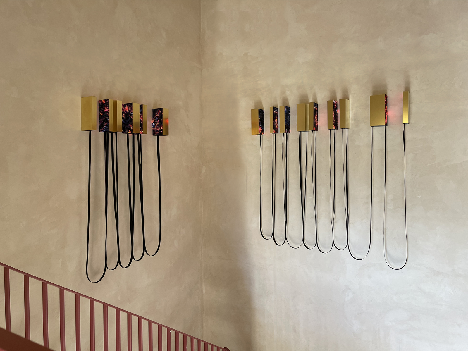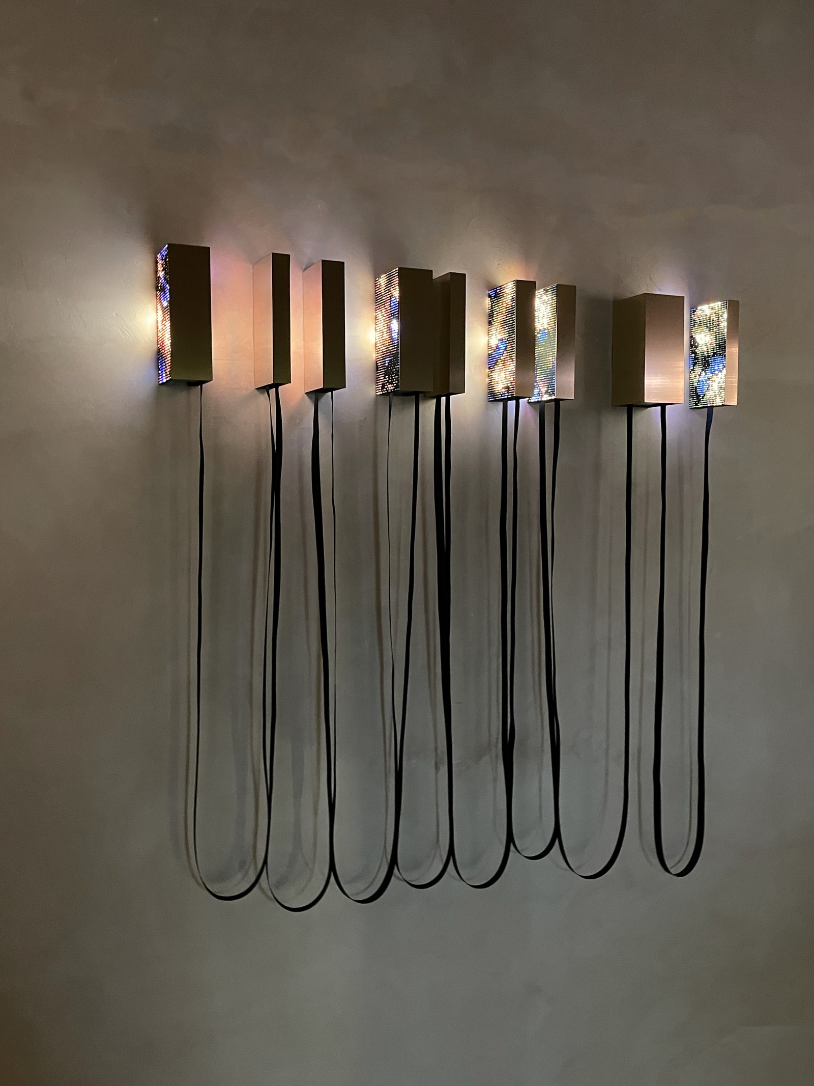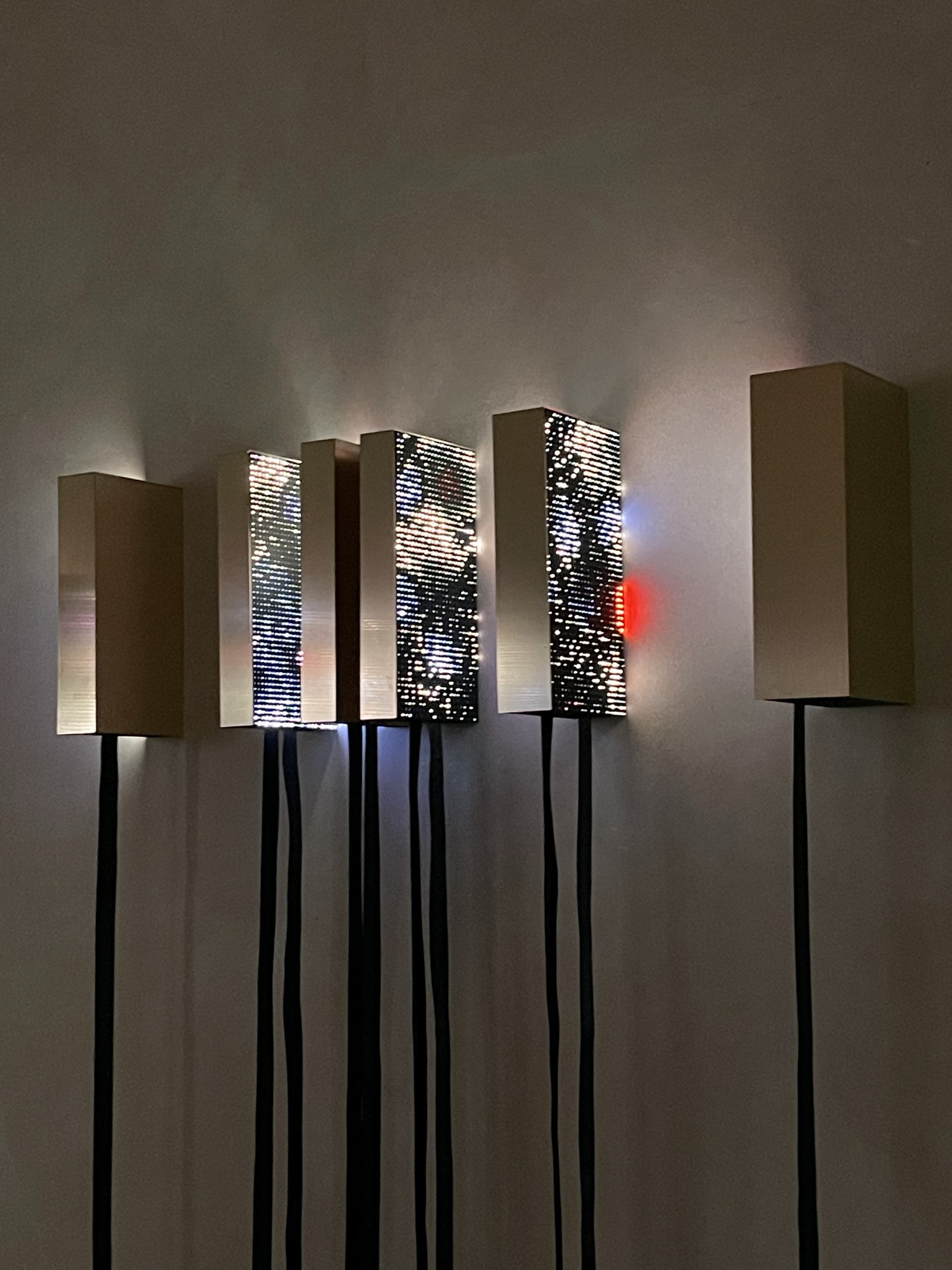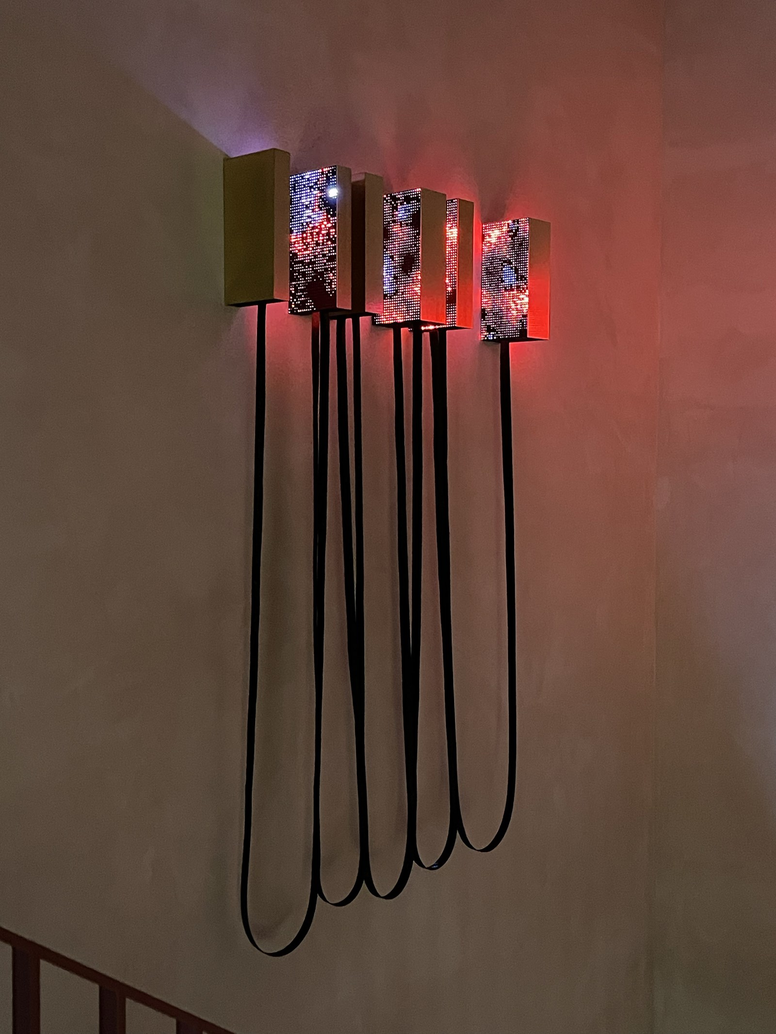 Bees behave through complex social waves, an in-chain survival technique. Likewise, each LED cell in "Swarm" –presented with a display reminiscent of honeycomb plates– is fundamental to the neighbouring one, recreating this dynamic of group wave with a high aesthetic value. To achieve this effect, "Swarm's" algorithm uses the computational principle of cellular automata, developed by the mathematician John von Neumann. The logic of this system works through the influence of neighbouring units.